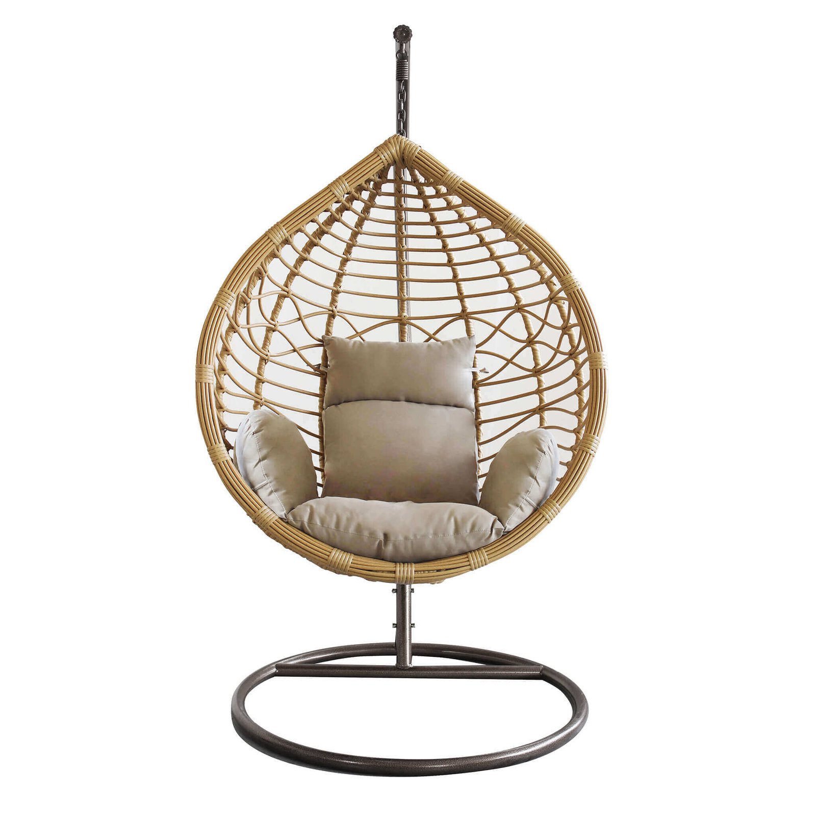 La Poltrona Sospesa con corda intrecciata – ELISE unisce eleganza, comfort e materiali di alta qualità per trasformare ogni angolo del giardino in un’oasi di relax. Appartenente alla categoria delle sedute da giardino sospese, questo raffinato complemento d’arredo si distingue per la solida struttura in acciaio dal finish tortora opaco e per la seduta intrecciata in wicker naturale, proposta anche nei toni del grigio o bianco. L’intreccio, ben visibile nei dettagli visivi, esprime una lavorazione artigianale che richiama il fascino senza tempo dello stile boho-chic, perfetto per ambienti outdoor ricercati. Il design avvolgente della Poltrona Sospesa ELISE è pensato per offrire massimo comfort grazie al cuscino in poliestere coordinato, mentre la solida struttura in metallo tubolare (da 42 x 2,5 mm e 42 x 1,5 mm per la base) garantisce resistenza e stabilità. Con dimensioni generose (Ø 105 x 195h cm, seduta 105 x 71 x 120 cm), si rivela ideale per concedersi un momento tutto per sé all’aria aperta, sia su un patio moderno che in un giardino mediterraneo. Perfetta per immergersi in un’atmosfera rilassante, la poltrona sospesa ELISE dona un tocco naturale e sofisticato a qualsiasi spazio esterno.