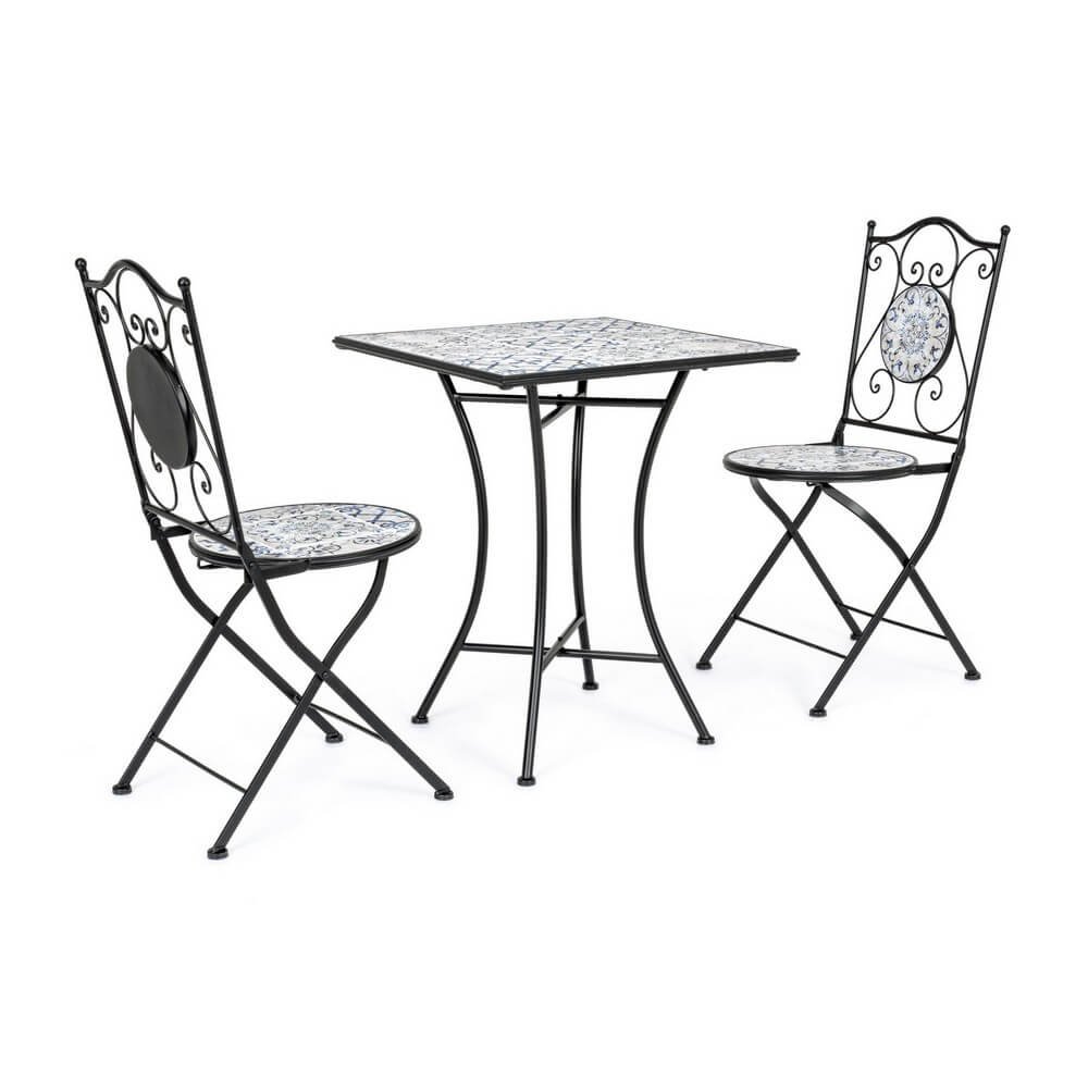 struttura in acciaio trattato per l’esterno (e-coating) e verniciato a polvere epossidica. piano, seduta e decori in ceramica. sedia pieghevole. tavolo gambe da assemblare.