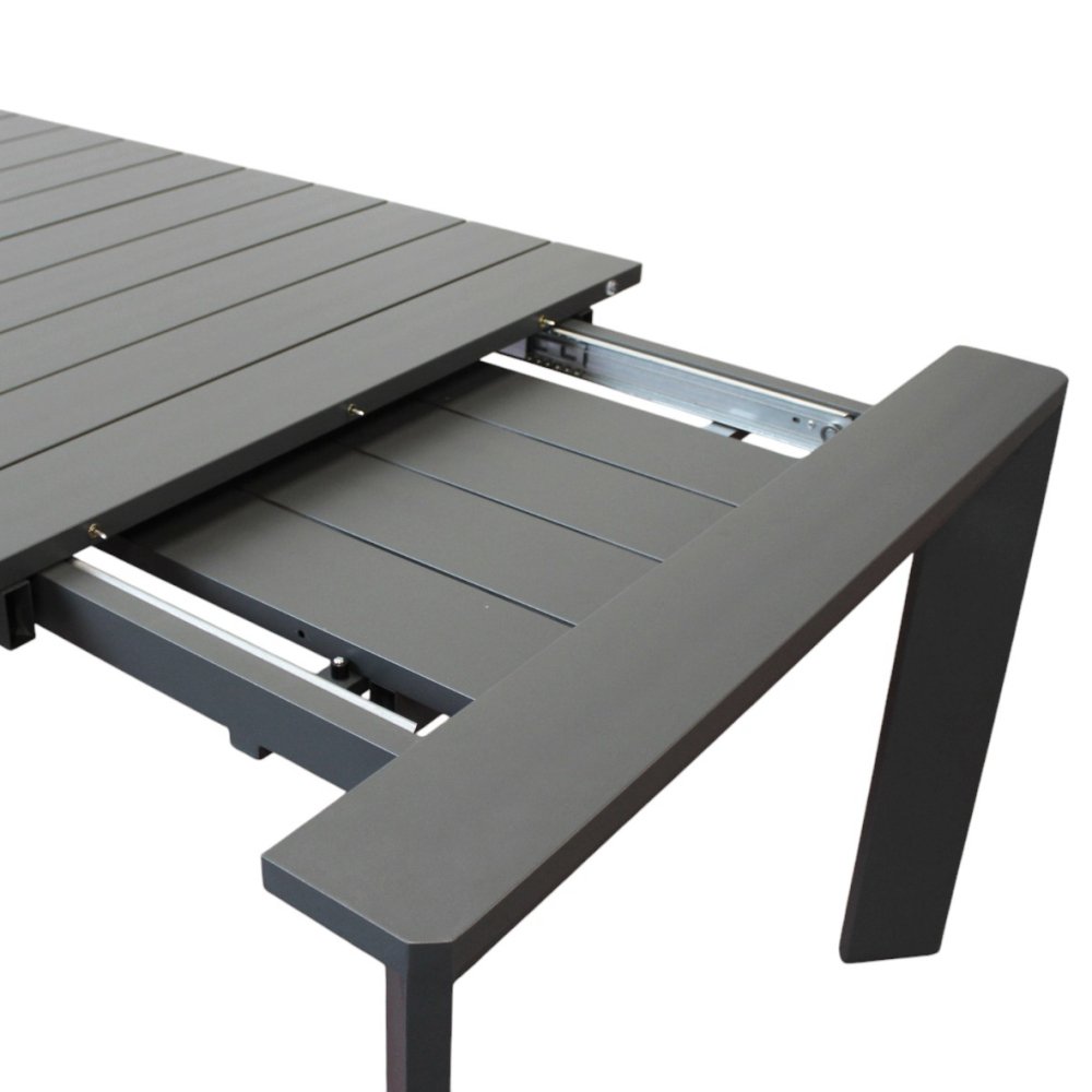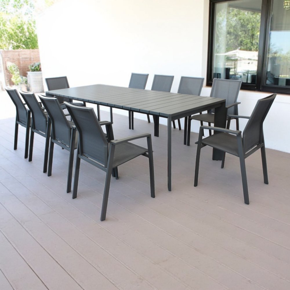 Il Tavolo allungabile da giardino 200/250×100 – UNA rappresenta la perfetta sintesi tra funzionalità e design contemporaneo, ideale per arredare con stile spazi esterni come terrazze, giardini o aree ristorative all’aperto. La struttura in alluminio verniciato, proposta nella raffinata finitura antracite, garantisce solidità, resistenza agli agenti atmosferici e una manutenzione minima, rendendolo perfetto per un uso intensivo anche in ambienti professionali. Il piano a doghe orizzontali esprime un’estetica moderna ed essenziale, valorizzata da linee pulite e proporzioni equilibrate. Grazie al suo sistema di estensione, il tavolo UNA passa agevolmente da 200 a 250 cm di lunghezza, offrendo fino a 10 comodi posti a sedere e adattandosi con versatilità a ogni occasione conviviale. Il design slanciato delle gambe e la geometria minimale trasmettono una sensazione di leggerezza visiva che si integra armoniosamente in contesti di arredo outdoor moderni. Questo tavolo da giardino allungabile è la scelta ideale per chi cerca eleganza, grande capienza e praticità in un unico arredo, capace di valorizzare l’esperienza del vivere all’aria aperta con stile e comfort.
