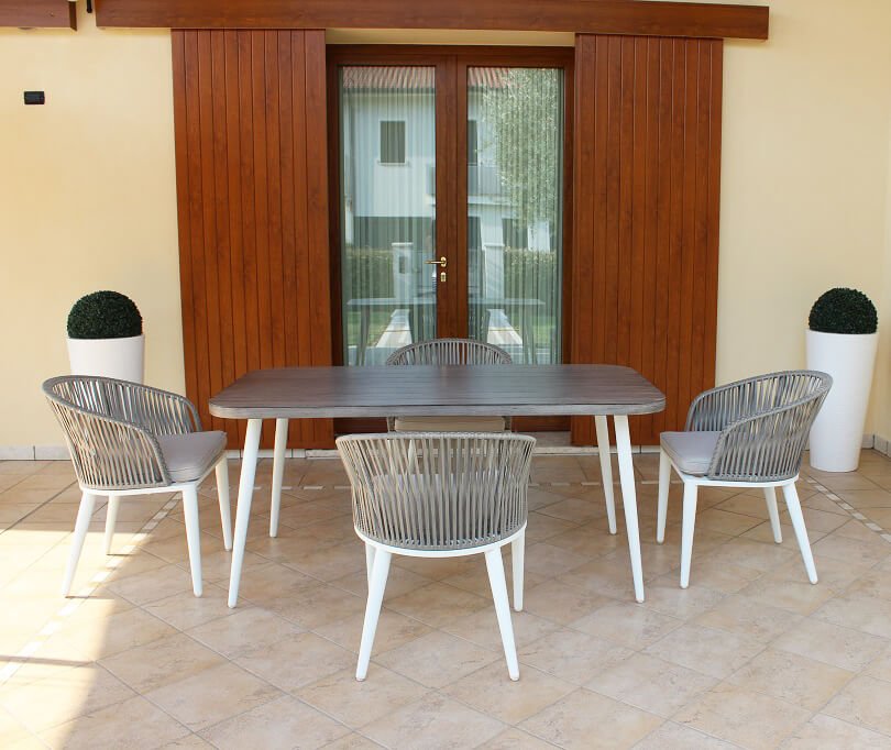 Il Tavolo con ripiano effetto Legno 160×90 – FREEMAN rappresenta la perfetta sintesi tra design moderno e funzionalità per l’arredo giardino. Realizzato interamente in alluminio, garantisce una struttura solida e durevole, ideale per l’uso esterno in qualsiasi stagione. Il piano, in alluminio grigio con raffinata finitura effetto legno, riproduce con grande realismo le venature naturali, offrendo un colpo d’occhio elegante e contemporaneo. Le gambe bianche, affusolate e leggermente inclinate, alleggeriscono visivamente l’insieme e donano un tocco minimalista e di tendenza. Le dimensioni generous (160×90 cm) consentono una comoda fruizione quotidiana per pranzi e cene in compagnia, rendendolo perfetto per terrazzi, patii e giardini. Il tavolo FREEMAN, nella sua versione fissa, è pensato per chi cerca un complemento d’arredo da esterno che abbini estetica, facilità di manutenzione e resistenza agli agenti atmosferici. Ideale per ambienti outdoor arredati in stile moderno o industriale, esprime il massimo del suo valore in contesti conviviali all’aperto, dove regala un’atmosfera accogliente ed essenziale.