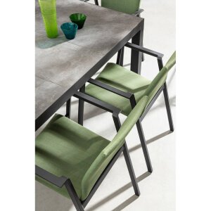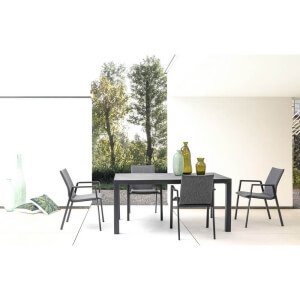 Il Tavolo Alluminio Antracite Moderno da Esterno 160×90 – MASON è la scelta ideale per arredare con stile e funzionalità gli spazi outdoor contemporanei. Il suo design minimale e lineare si distingue per l’eleganza sobria del colore antracite, perfettamente in tono con le tendenze moderne dell’arredo giardino. La struttura in alluminio verniciato a polvere con finitura poliestere lo rende leggero ma al contempo resistente, garantendo una protezione efficace contro gli agenti atmosferici e l’umidità, ideale quindi per terrazzi, verande, giardini o aree piscina. Il piano in ceramica da 10 mm di spessore aggiunge un tocco raffinato e contemporaneo, offrendo una superficie estremamente resistente al calore, ai graffi e di facile manutenzione. Le gambe assemblabili semplificano il trasporto e il montaggio, mentre la viteria in acciaio inox assicura una solidità durevole nel tempo. Con il tavolo MASON ogni momento all’aria aperta diventa un’esperienza conviviale e di classe, valorizzando l’ambiente circostante con una presenza discreta ma ricca di personalità.