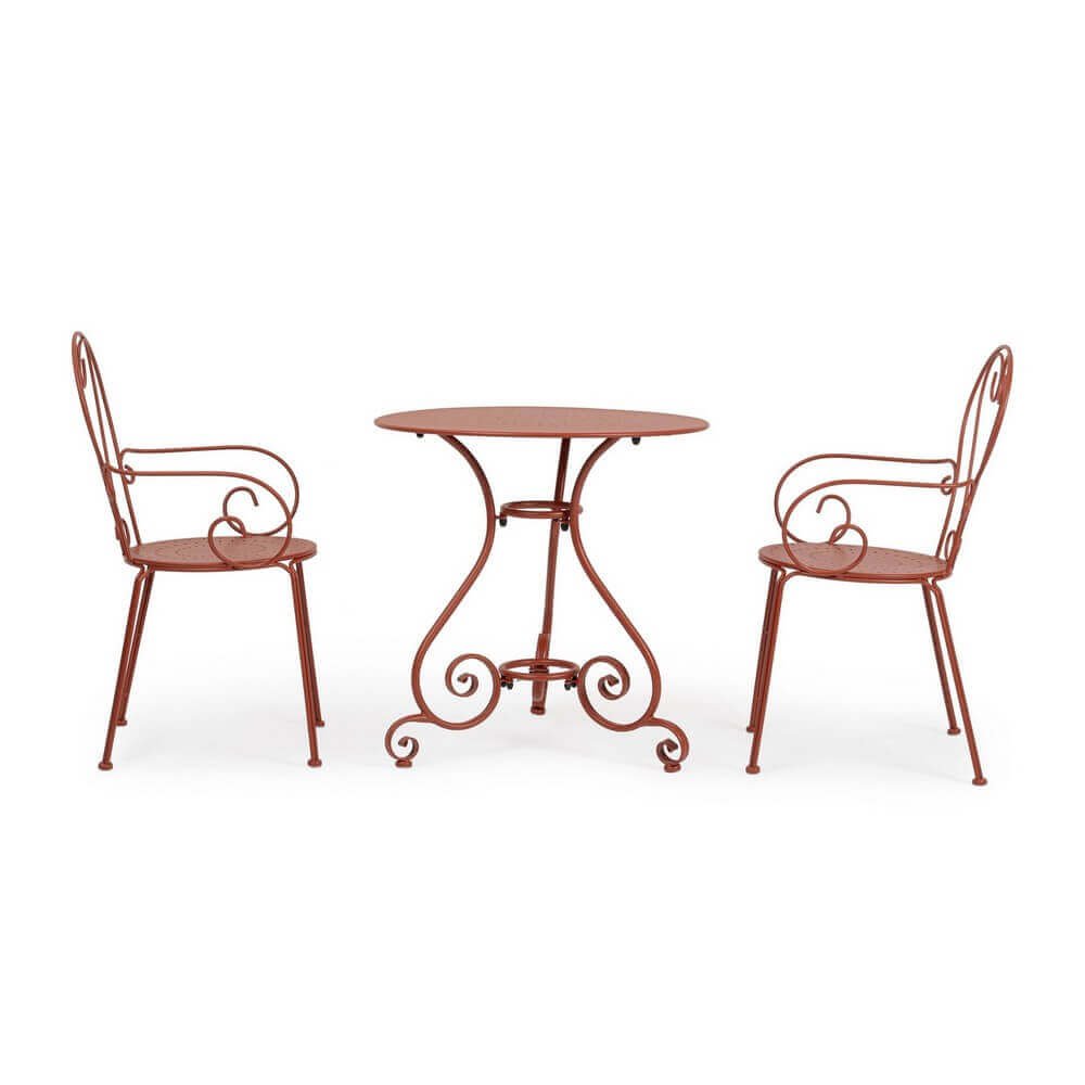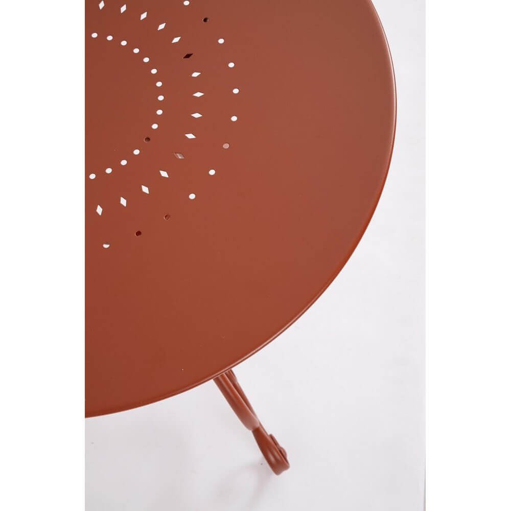 Il Tavolo Rotondo Acciaio Rosso Rustico da Esterno ร70 cm โ JENARIS unisce raffinatezza e funzionalitร in un design che richiama lโeleganza delle atmosfere vintage da giardino. Realizzato interamente in acciaio trattato per esterno con e-coating e verniciato a polvere con finitura opaca, questo tavolo da giardino รจ progettato per garantire resistenza agli agenti atmosferici, preservando nel tempo la brillantezza del suo caldo colore rosso ruggine. Le sue linee sinuose, con gambe abilmente curvate e dettagli a ricciolo, conferiscono un fascino romantico e retrรฒ, ideale per ambienti esterni dal gusto rustico o shabby chic. Compatto con il suo diametro di 70 cm, รจ perfetto per balconi, terrazze, patii o angoli verdi dove creare unโaccogliente area relax o una colazione allโaperto. Il design traforato del piano aggiunge un tocco decorativo pur mantenendo la praticitร necessaria per lโuso quotidiano. Il Tavolo JENARIS esprime al meglio il suo valore in contesti conviviali allโaperto, offrendo stile e durabilitร per godere appieno dei momenti allโaria aperta.