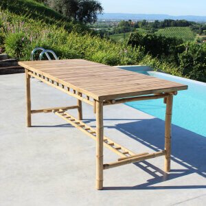 Il Tavolo da giardino in bamboo – LIBRE rappresenta la perfetta armonia tra design naturale e funzionalità outdoor. Realizzato interamente in bambù, un materiale rinnovabile noto per la sua resistenza e leggerezza, questo tavolo si distingue per uno stile esotico e autentico che richiama atmosfere tropicali e ambienti rilassati. Le sue linee semplici e la struttura solida ne fanno un elemento d’arredo ideale per terrazze, verande o giardini, inserendosi con eleganza sia in contesti rustici che in spazi dallo stile bohémien o eco-friendly. Le dimensioni generose (200 x 80 x 75 cm h) lo rendono perfetto per ospitare comodamente più persone, ideale per cene all’aperto, momenti conviviali o brunch al sole. Il colore marrone naturale del bambù dona al tavolo LIBRE una calda tonalità organica che valorizza qualsiasi spazio esterno con un tocco di autenticità artigianale e senso di benessere. Pensato per chi cerca un complemento d’arredo esterno capace di unire estetica, ecologia e praticità, questo tavolo da giardino in bamboo esprime al meglio il suo valore in ambienti informali dove la convivialità incontra uno stile di vita sostenibile.