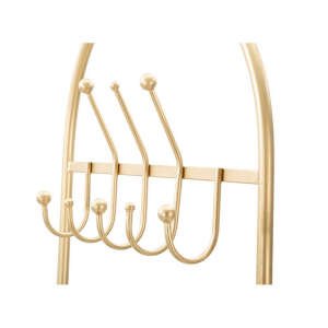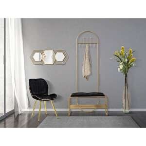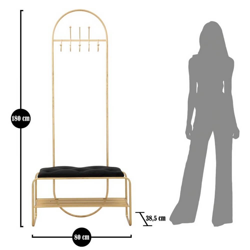 Panca in metallo dorato con seduta imbottita in velluto sintetico. Lo schienale si allunga fino a diventare un pratico appendiabiti con 8 ganci. Il ripiano inferiore รจ realizzato a griglia ed รจ ideale per riporre le scarpe. Il design semplice ed armonico lo rendono pratico senza rinunciare al buon gusto.