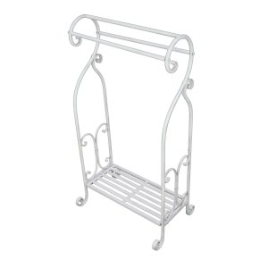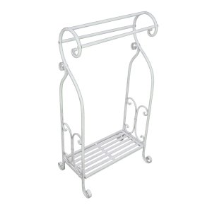 Elegante e funzionale, il Portasciugamani in Acciaio cm 37x33x90 – DEWAYNE è un complemento d’arredo perfetto per arricchire ambienti in stile shabby chic, provenzale o country. Realizzato in metallo resistente con trattamento a elettroforesi e verniciatura a polvere, si distingue per la sua finitura bianca opaca che dona un tocco romantico e luminoso al bagno o alla zona lavanderia. Le sinuose linee in ferro battuto e i dettagli decorativi curvilinei conferiscono un carattere raffinato e vintage, mentre la struttura solida e ben bilanciata offre spazi multipli per appendere asciugamani e riporre oggetti sul ripiano inferiore a doghe. Grazie alle sue dimensioni compatte, il portasciugamani DEWAYNE si adatta anche a spazi ridotti, aggiungendo charme e praticità all’ambiente. L’armonia tra estetica e funzione lo rende ideale per chi cerca decorazioni in ferro dallo stile classico, ma con una presenza discreta e sofisticata. Perfetto per trasformare un angolo di servizio in un raffinato punto d’arredo, valorizza ogni gesto quotidiano con un tocco di eleganza senza tempo.