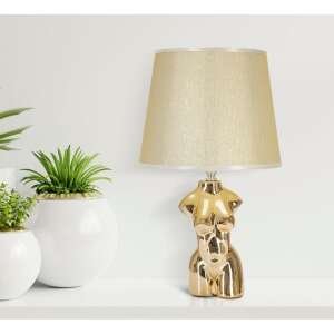Lampada da tavolo in ceramica dorata a forma di busto di donna. Completa di paralume in tessuto beige.