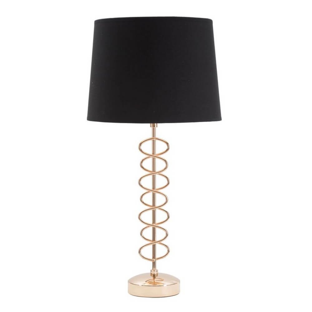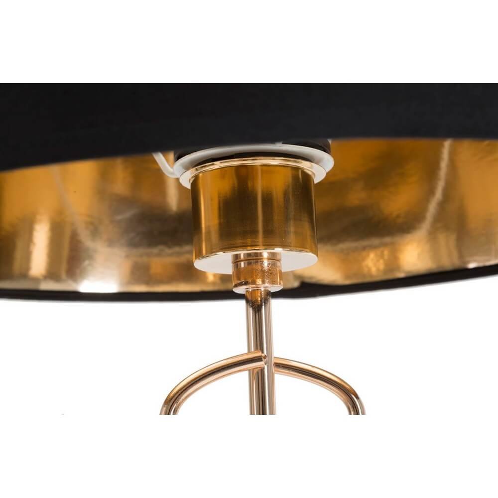 Lampada da tavolo in metallo dorato con paralume in tessuto nero. La lavorazione della base, semplice ed elegante, ed il contrasto tra il nero e l’oro donano un tocco di raffinatezza ad ogni ambiente.