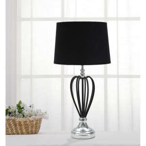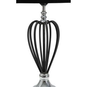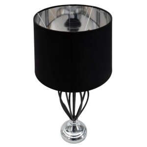 Elegante lampada da tavolo in stile glam in metallo con decorazioni metalliche nere e paralume in tessuto nero. Il design lineare e morbido si adatta ad ogni tipo di arredo.