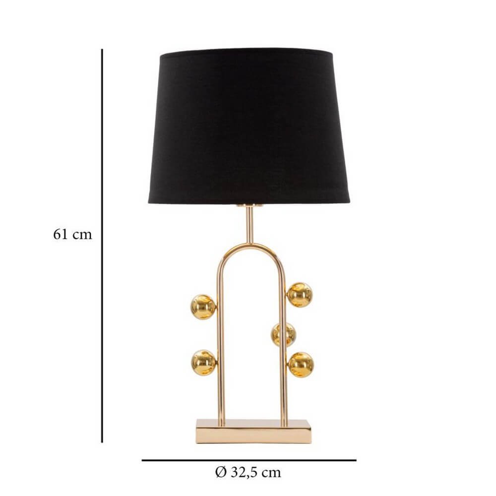 Lampada da tavolo in metallo dorato dal particolare design lineare impreziosito da sfere decorative e paralume in tessuto nero.