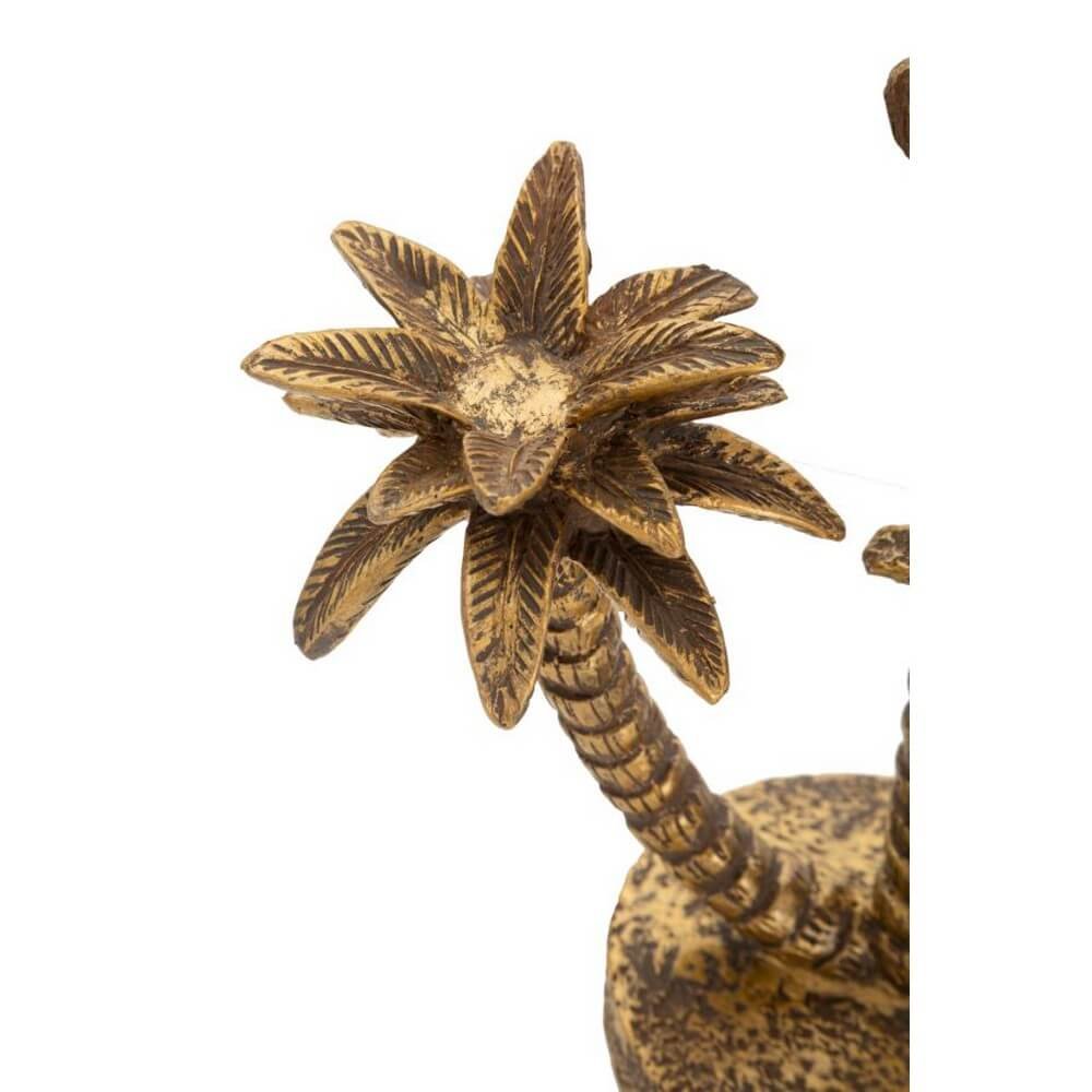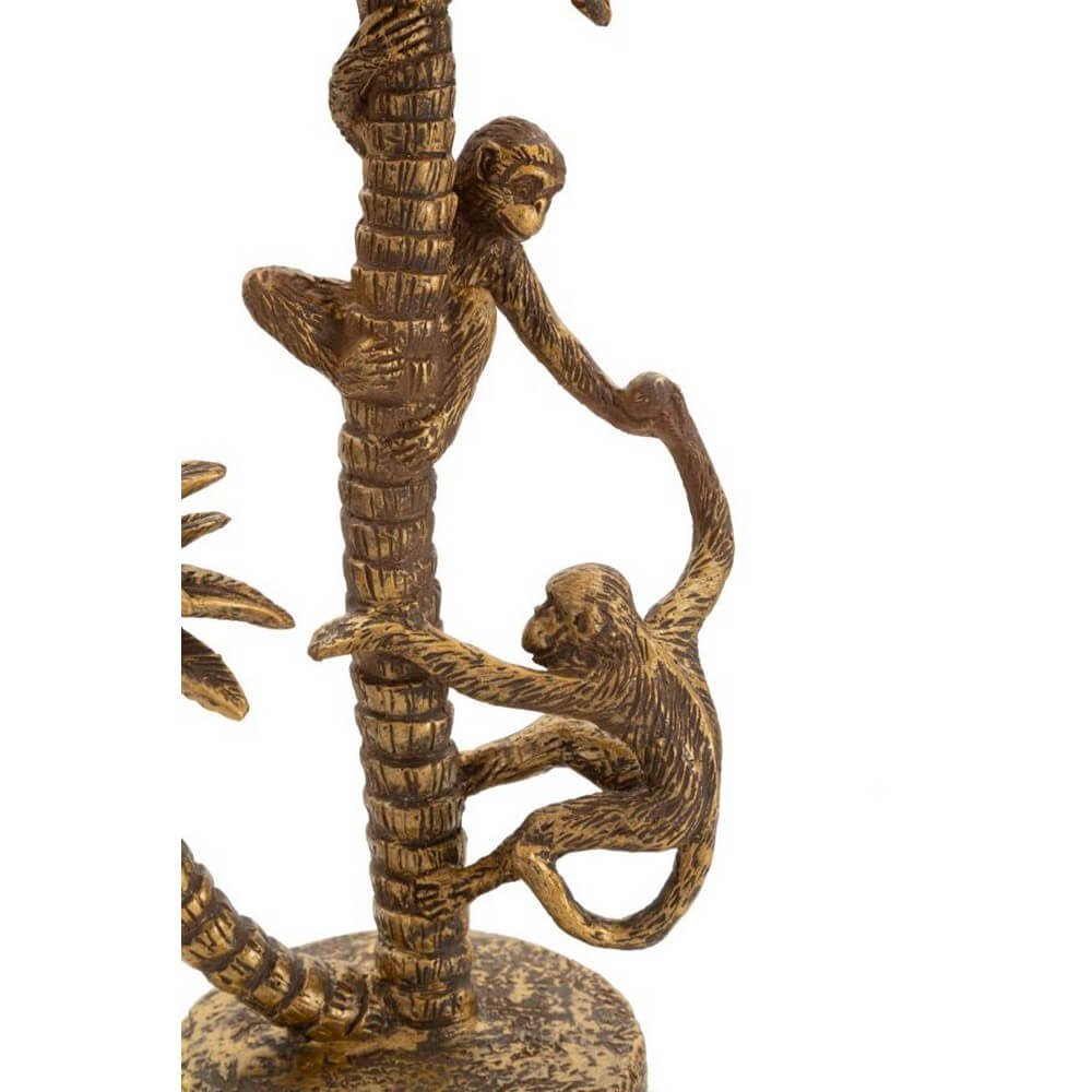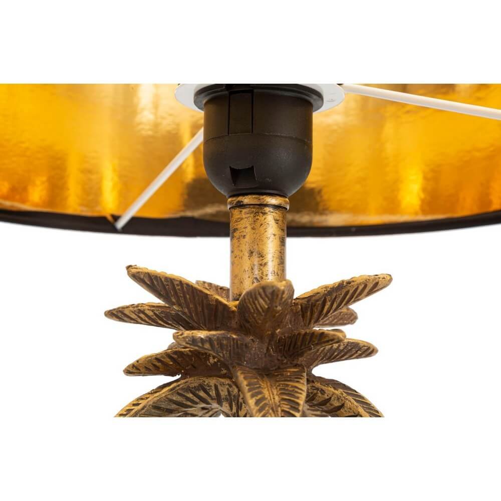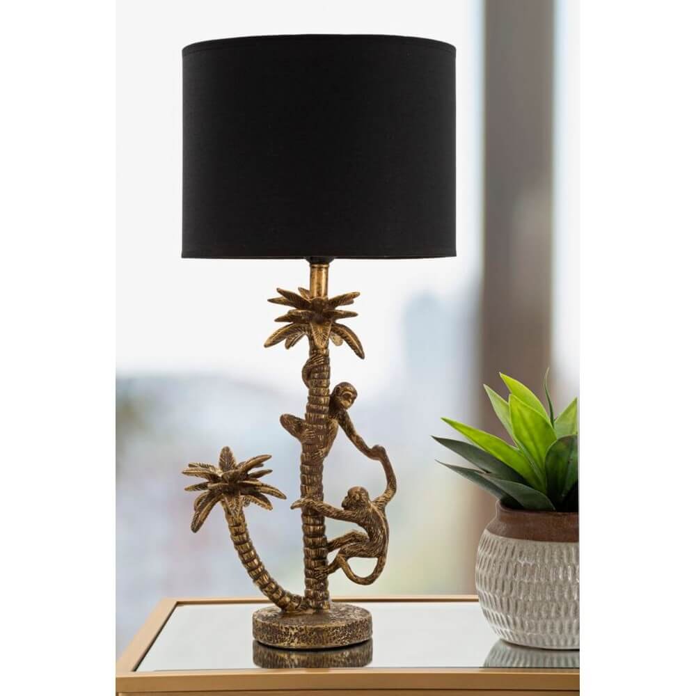 Lampada da tavolo in resina dorata con paralume in tessuto nero. La struttura raffigura una palma da cocco con delle simpatiche scimmiette. Un tocco di allegria da abbinare ad ogni tipo di arredamento.