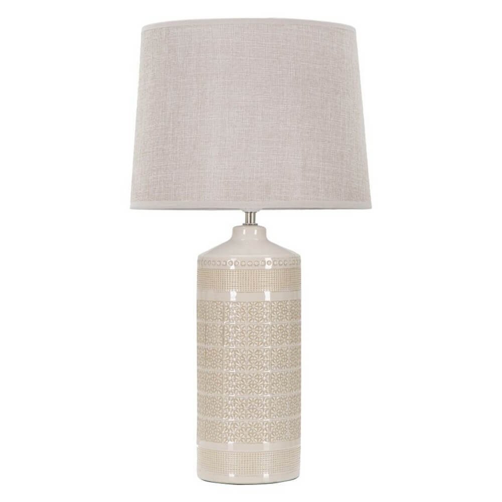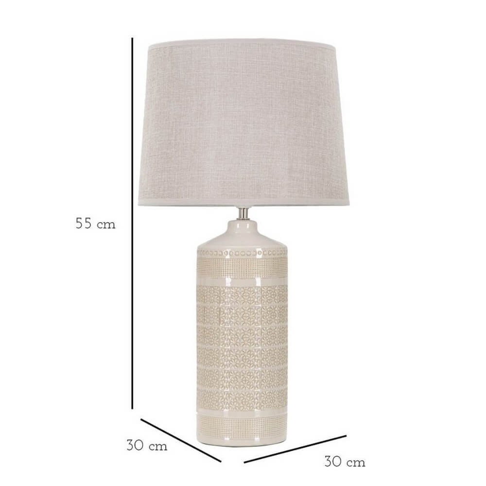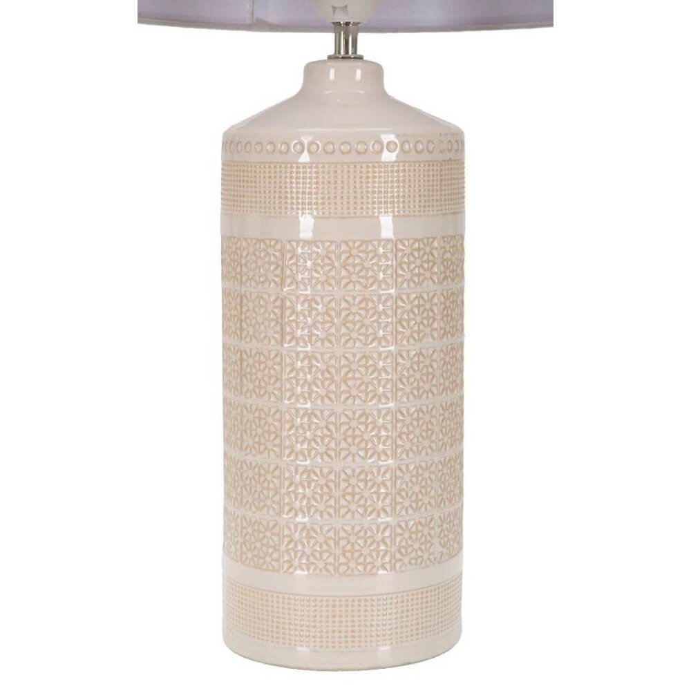 Lampada da tavolo in ceramica con eleganti decorazioni geometriche in rilievo. Completa di paralume in tessuto bianco.