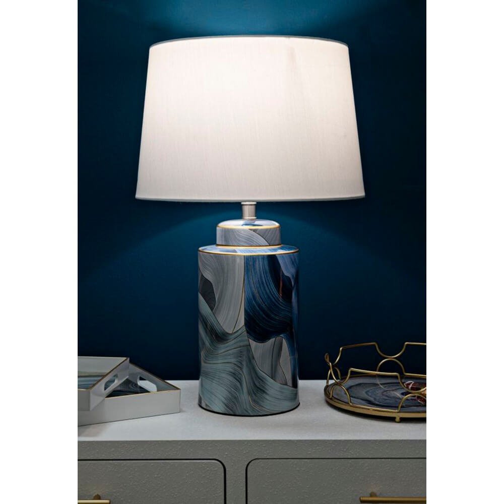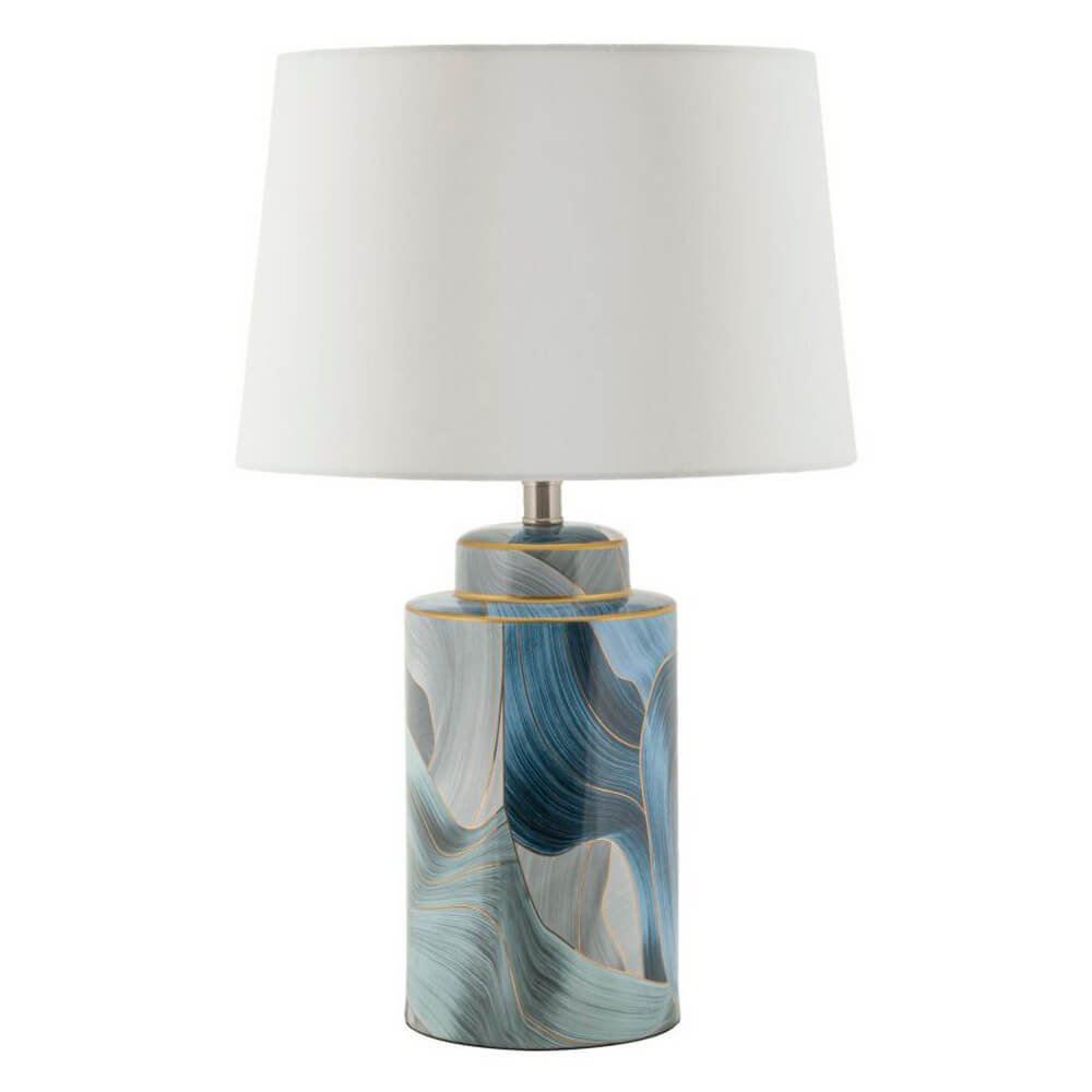 Lampada in ceramica azzurra dal design che richiama delle pennellate impreziosita da rifiniture. Completa di paralume in tessuto bianco.