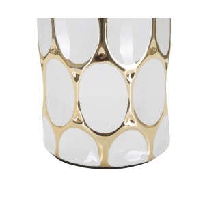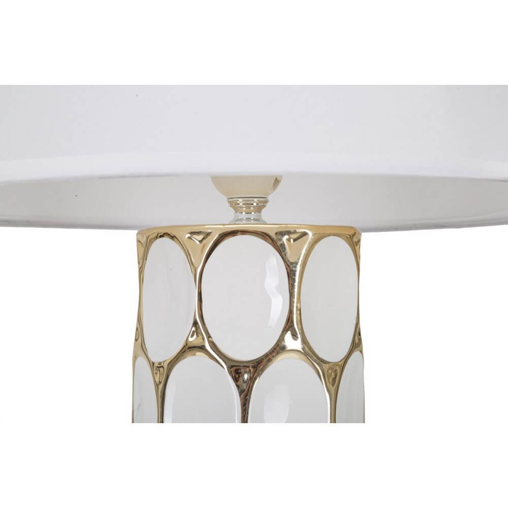 Lampada da tavolo in ceramica bianca e dorata con eleganti decorazioni geometriche in rilievo. Completa di paralume in tessuto bianco.