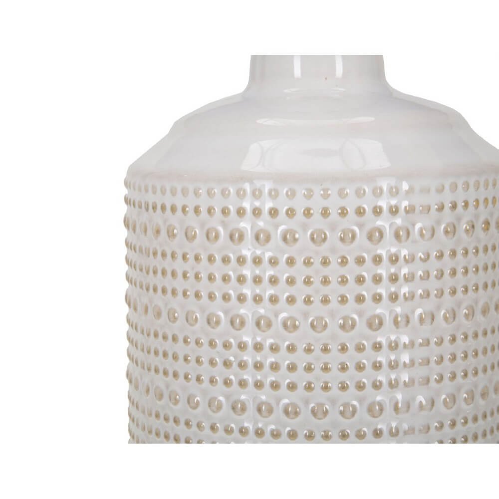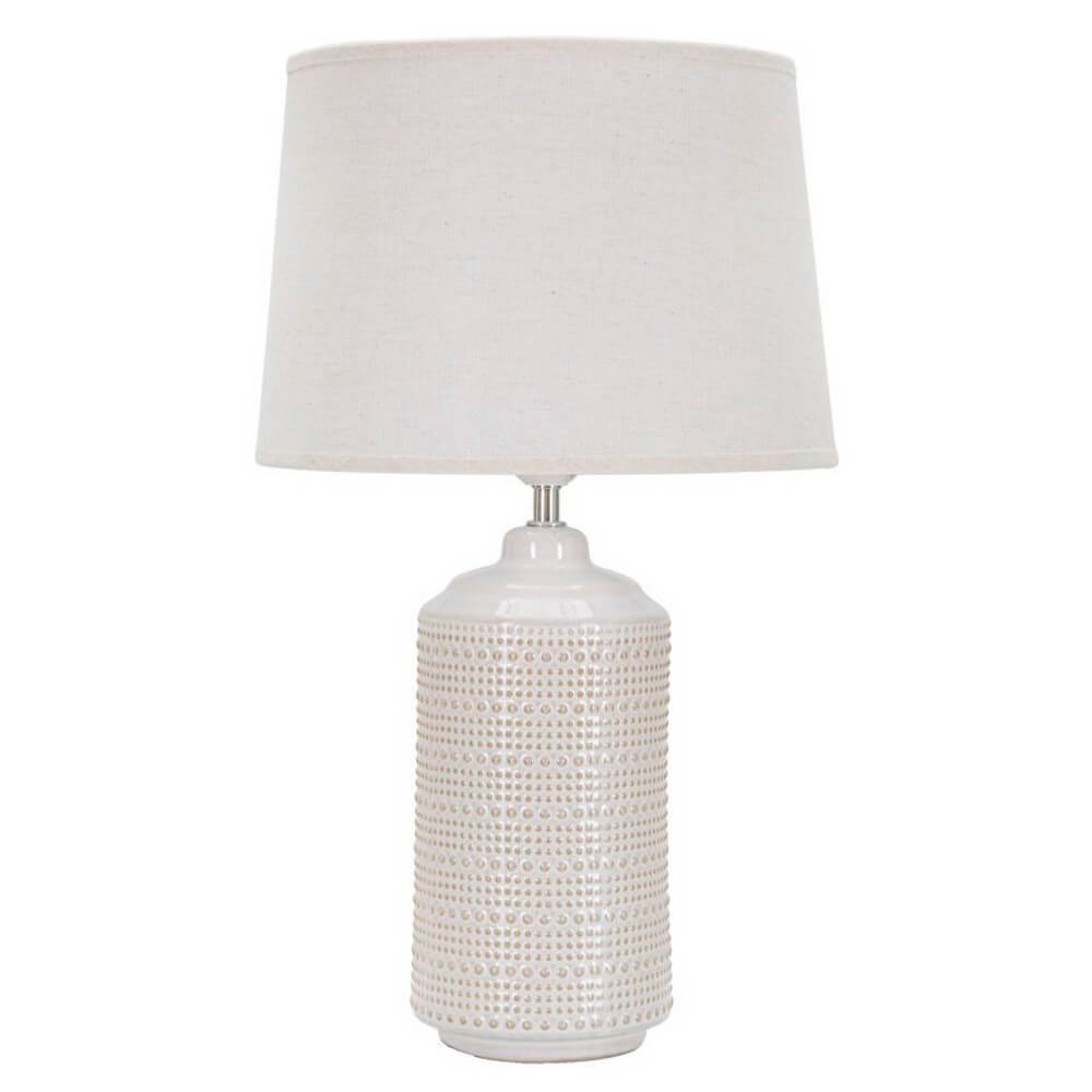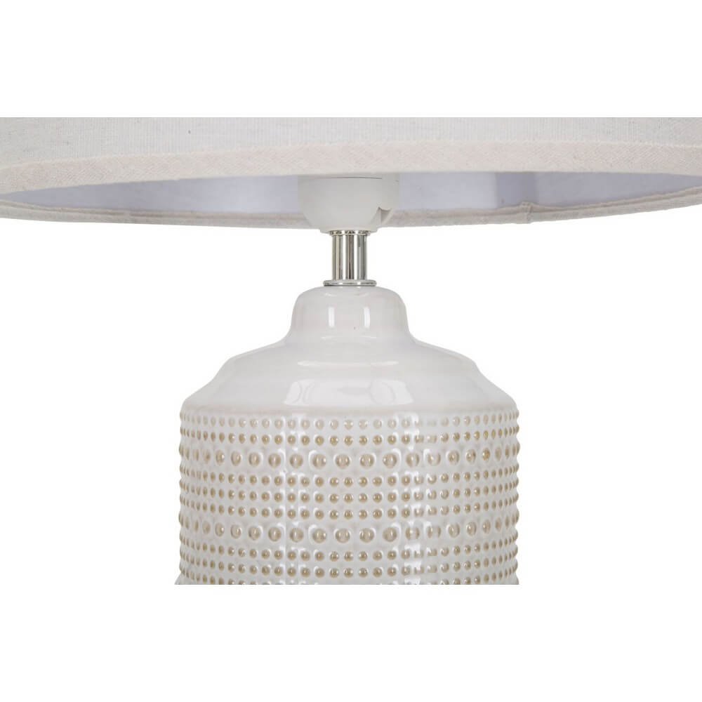 Lampada da tavolo in ceramica con eleganti decorazioni in rilievo. Completa di paralume in tessuto bianco.
