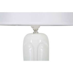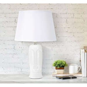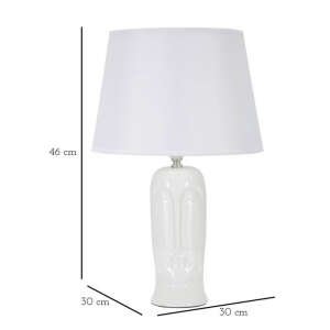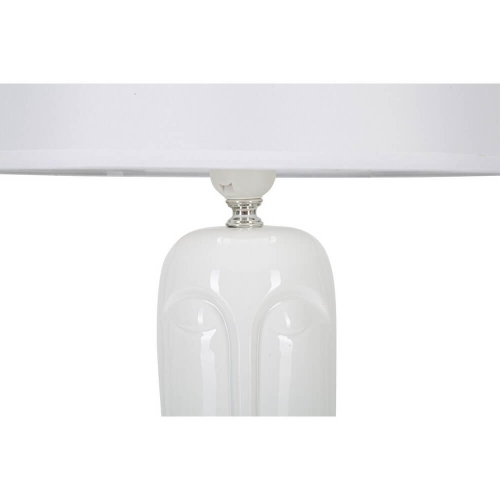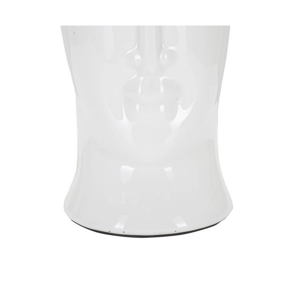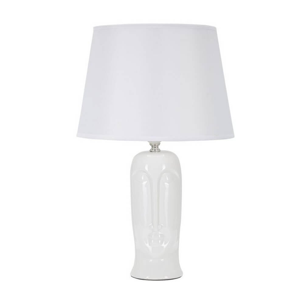 Lampada da tavolo in ceramica a forma di volto dai tratti essenziali e minimalisti. Completa di paralume in tessuto bianco.