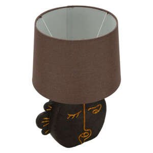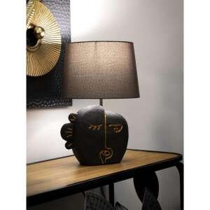 Lampada da tavolo in resina dalla forma ispirata ad un volto tribale impreziosita da tratti dorati. Completa di paralume in tessuto grigio.