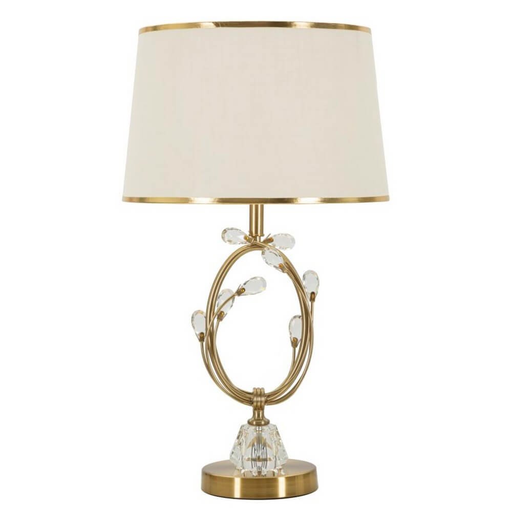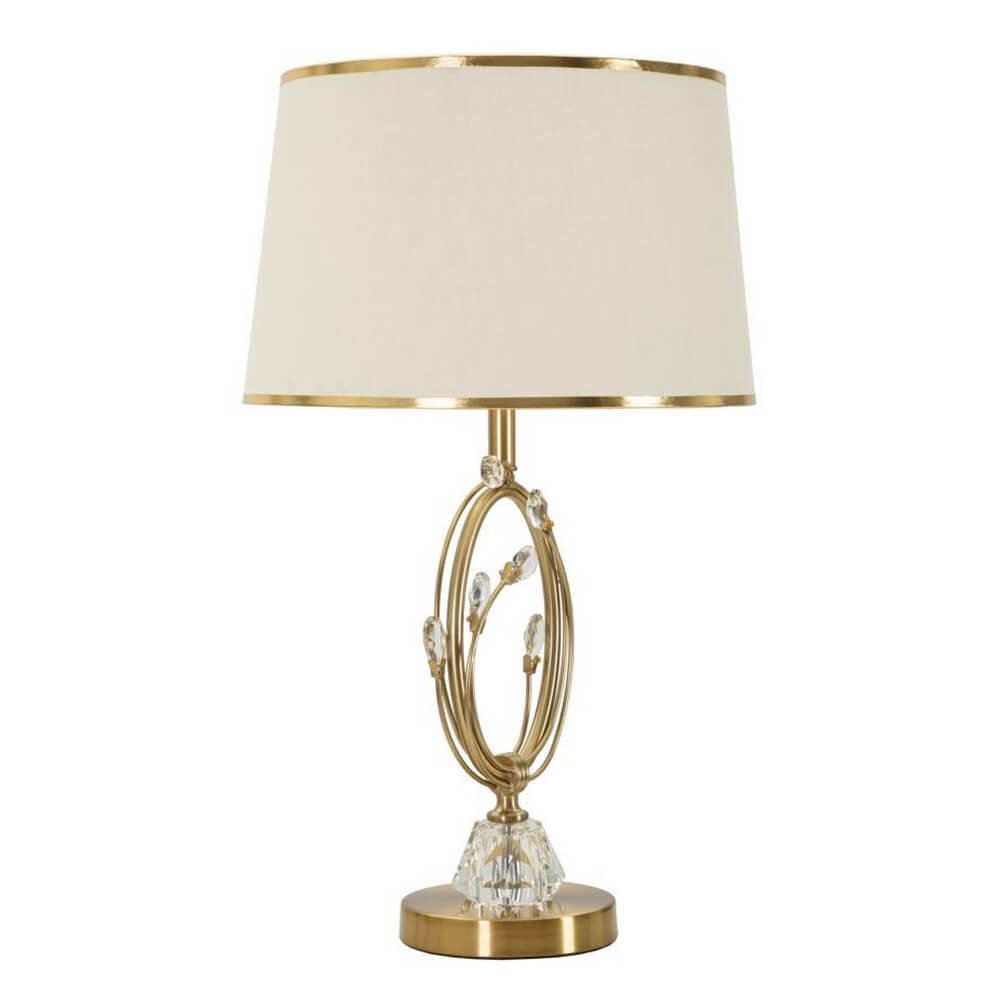 Lampada da tavolo in metallo dorato con decorazione geometrica con eleganti applicazioni che ricordano dei fiori. Completa di paralume in tessuto beige con finiture dorate.