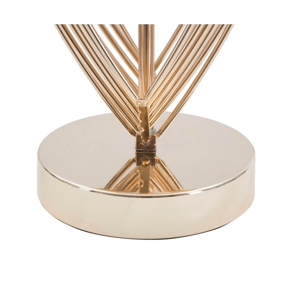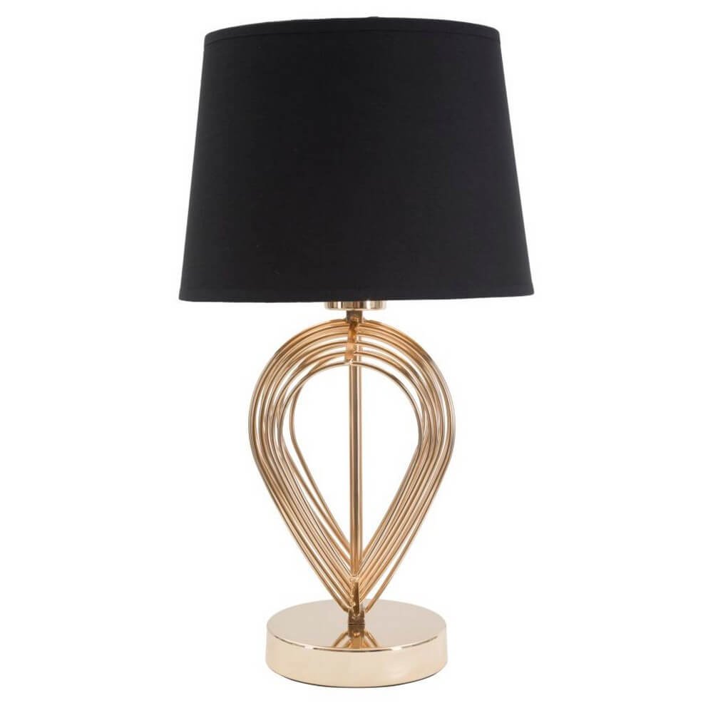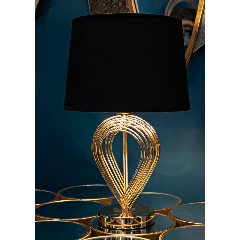 Lampada da tavolo in metallo dorato con paralume in tessuto nero. La lavorazione della base, semplice ed elegante, ed il contrasto tra il nero e l’oro donano un tocco di raffinatezza ad ogni ambiente.