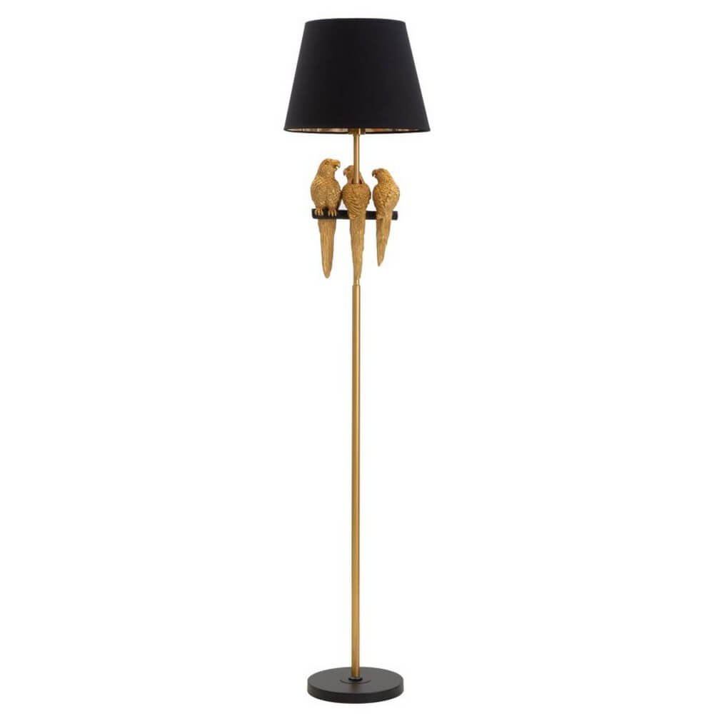 Piantana in metallo dorato con paralume in tessuto nero. L’asta è decorata con dei papagalli. L’unione tra l’oro e il nero creano un perfetto contrasto adatto ad ogni ambiente.