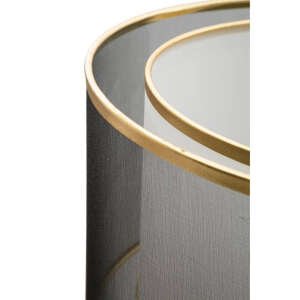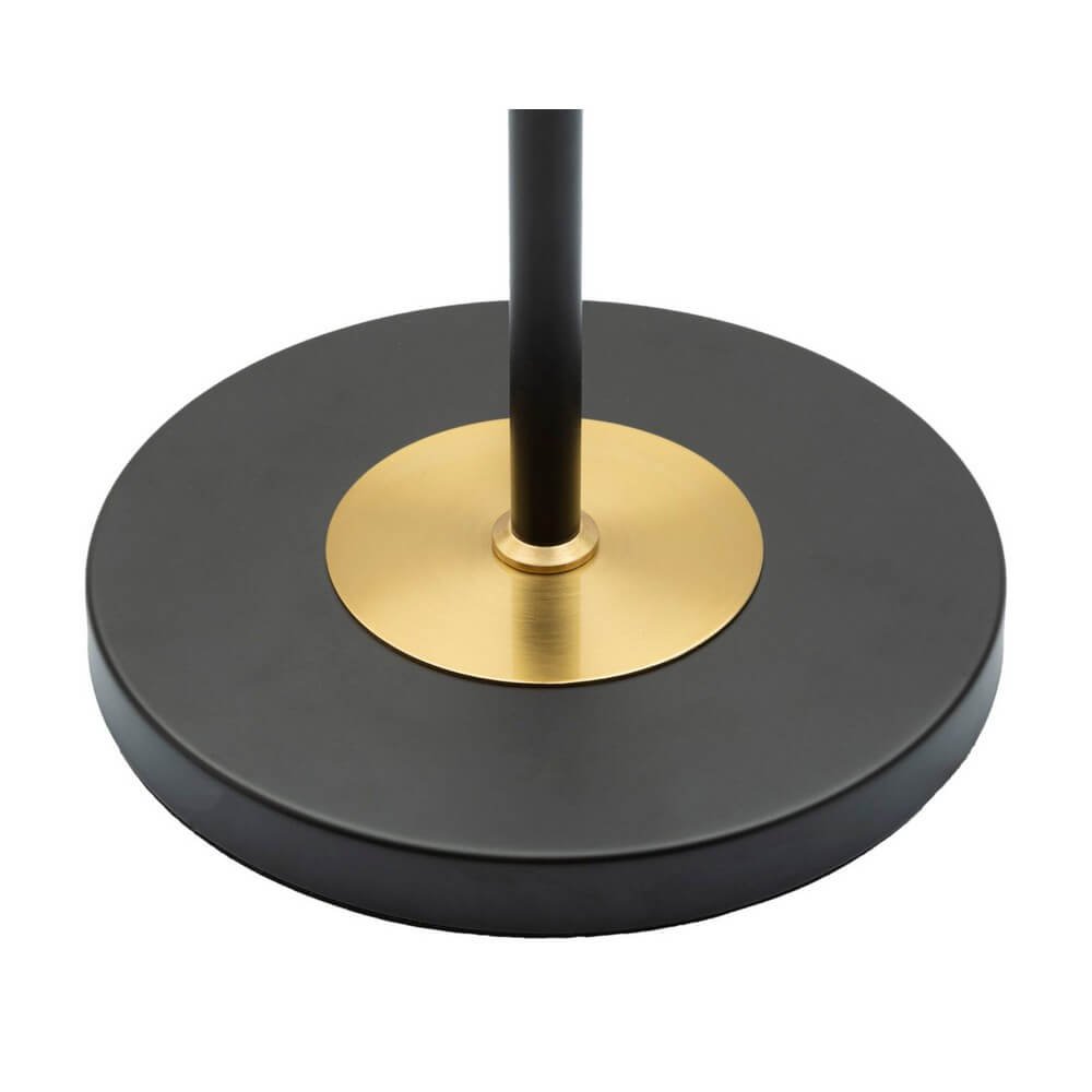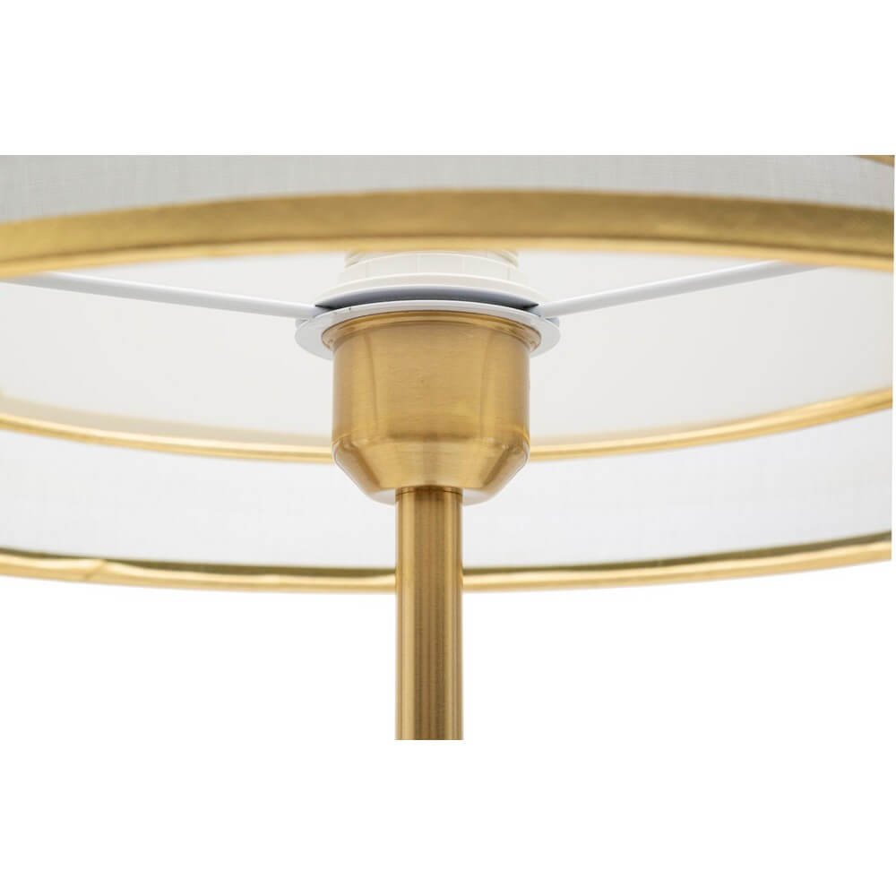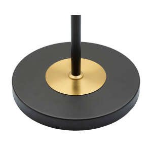 Essenziale piantana in metallo nero e oro con paralume in tessuto a due livelli, il livello interno è bianco mentre quello esterno è grigio trasparente, entrambi con un elegante bordo dorato.