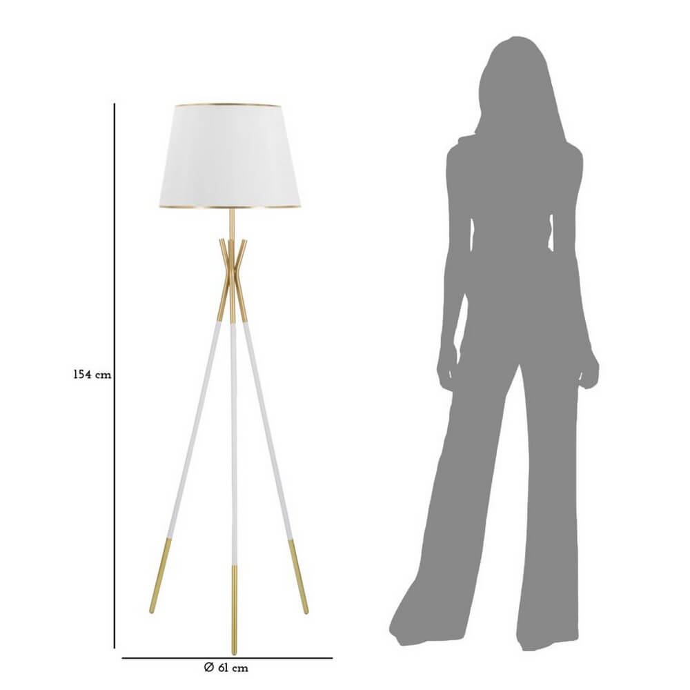 Piantana in metallo bianco e dorata composta da tre aste che si intersecano. Completa di paralume in tessuto bianco con bordi dorati.