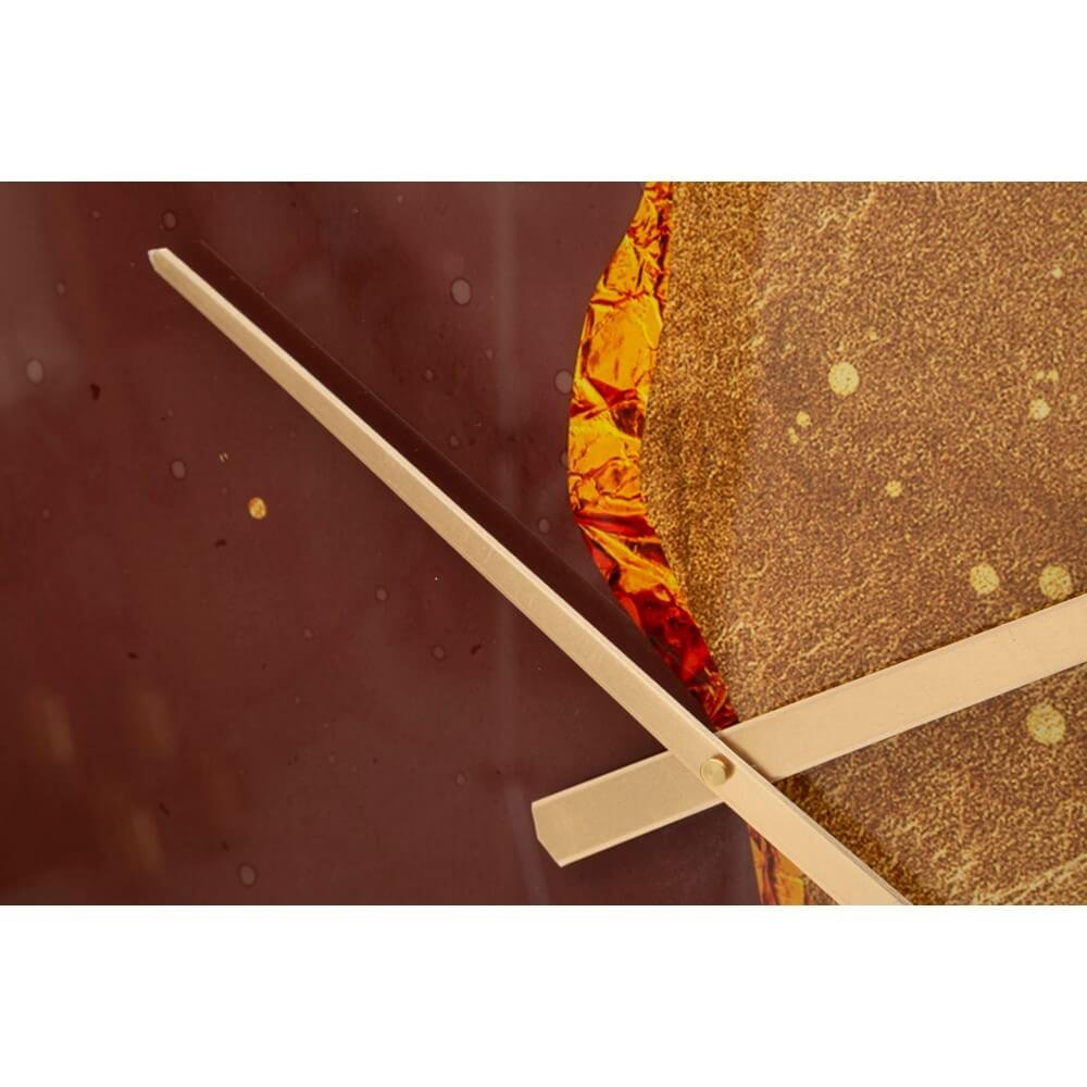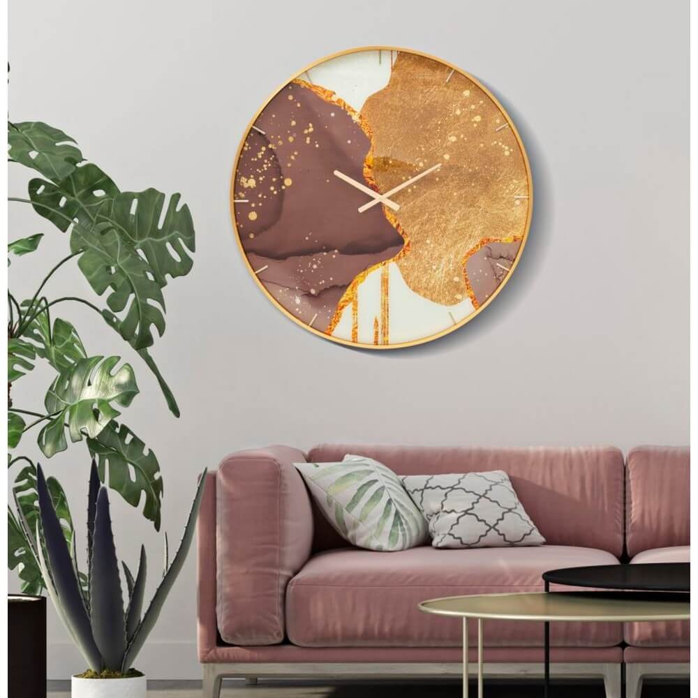 Orologio rotondo da parete con elegante cornice dorata e quadrante decorato con tonalità vivaci e accese.