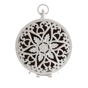 L’orologio da appoggio in acciaio vetro cm 14,5×5,5×18,5 – DUNSTAN è un complemento d’arredo dallo stile vintage che unisce fascino rétro e materiali resistenti. Realizzato in ferro con una finitura bianca volutamente invecchiata, presenta dettagli accurati come una cornice con piccole borchie decorative, piedini ricurvi e una finitura opaca che conferisce carattere e autenticità. Il quadrante, protetto da vetro, riporta numeri romani neri su fondo leggermente anticato e la scritta “Antiquité de Paris”, richiamando l’eleganza francese di fine ‘800. Pensato per essere collocato su mensole, comodini o consolle, il modello DUNSTAN non solo segna il tempo con precisione, ma arreda con gusto ambienti dallo stile classico, shabby chic o industriale. La struttura in acciaio lo rende solido e durevole, mentre il formato compatto lo rende versatile anche in spazi ridotti. Ideale per chi desidera arricchire la casa con dettagli ricercati e nostalgici, questo orologio esprime il suo massimo valore in contesti dove ogni oggetto racconta una storia senza tempo.