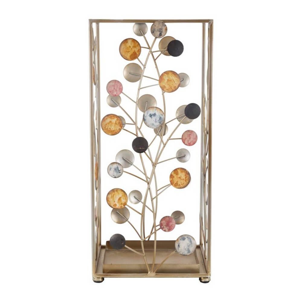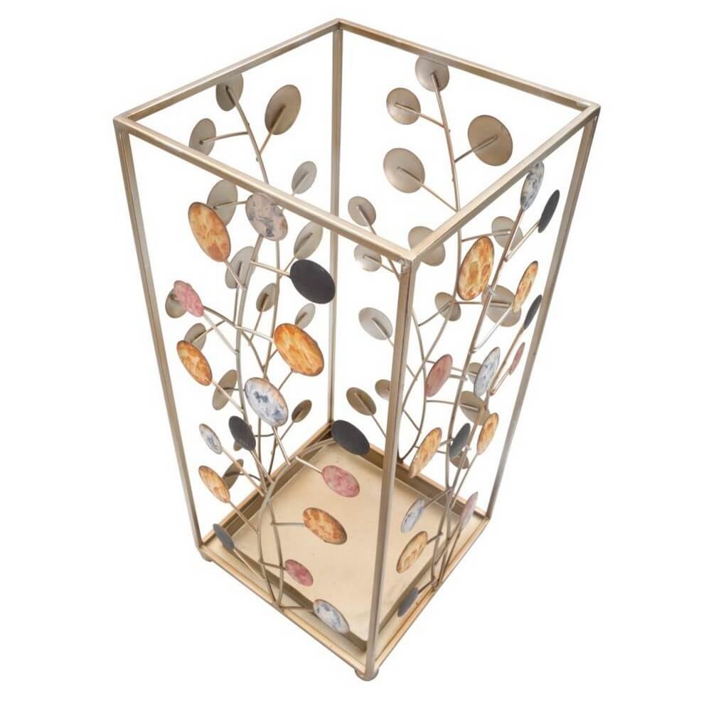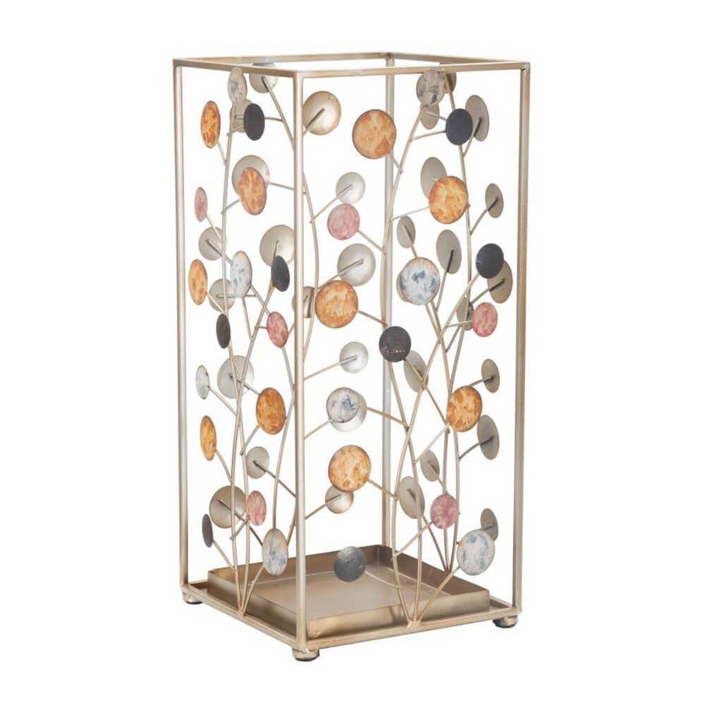 Elegante portaombrelli quadrato in metallo dorato con cerchi decorativi di diversi colori che richiamano i rami degli alberi con foglie e frutti. Un dolce tocco di eleganza per ogni ingresso.