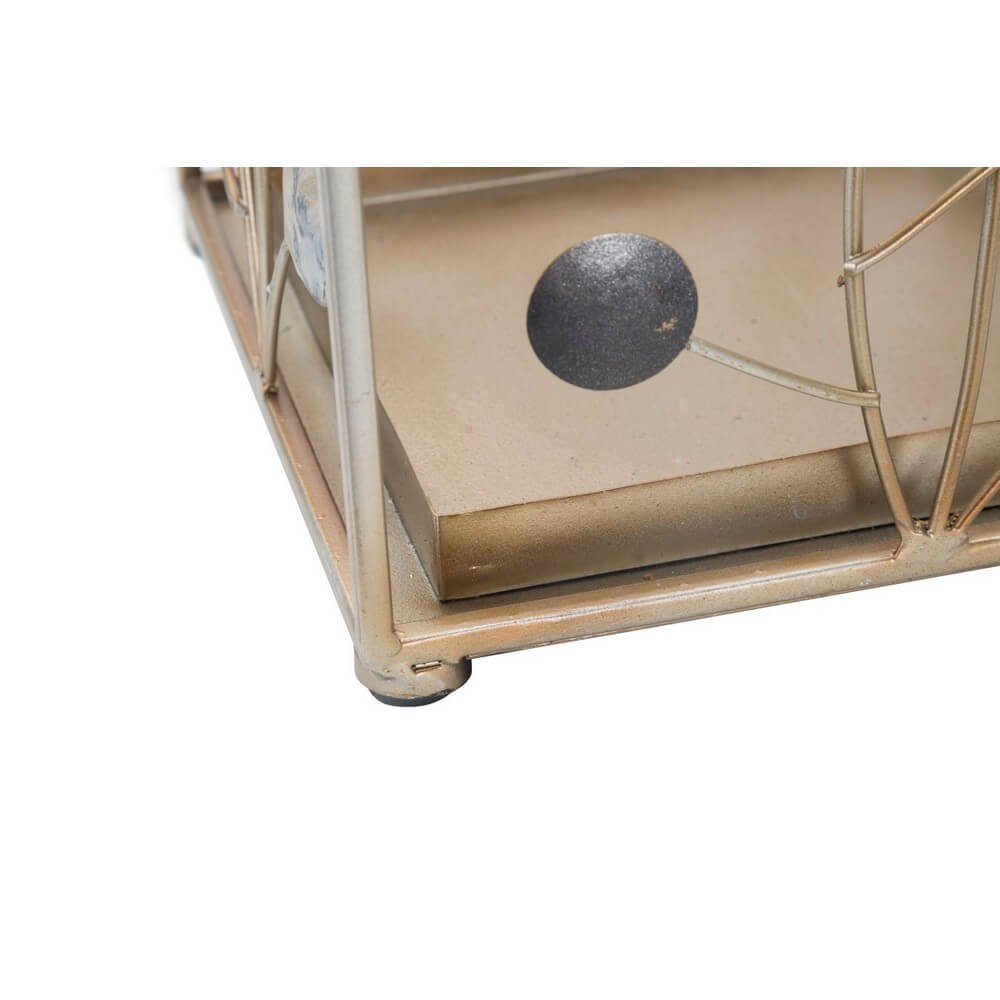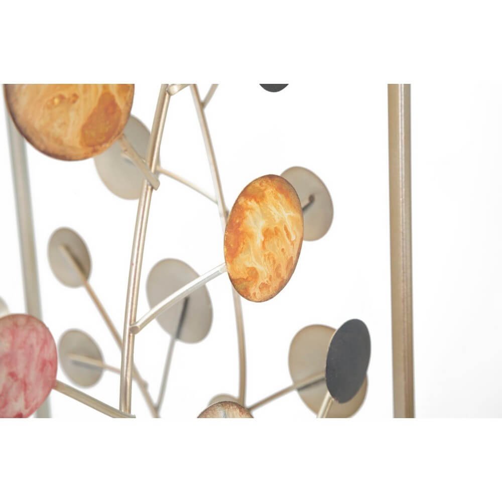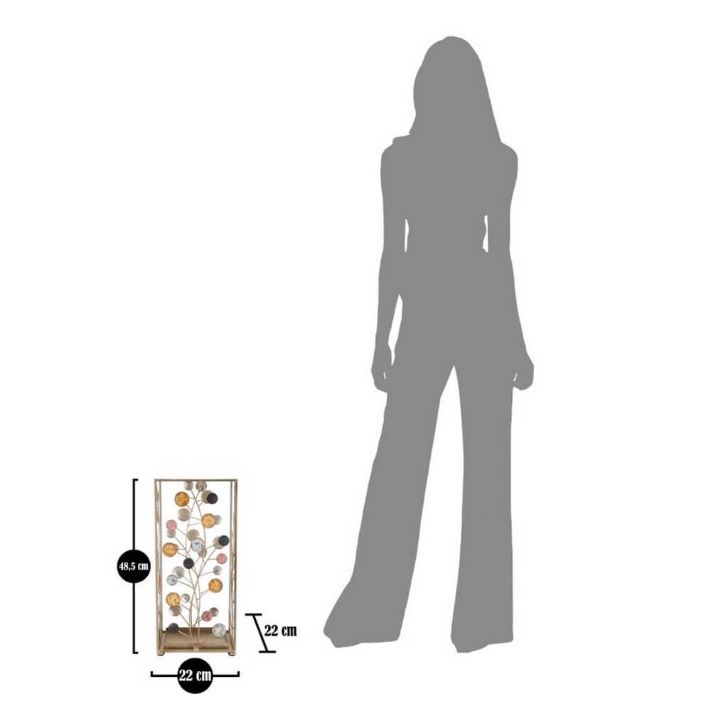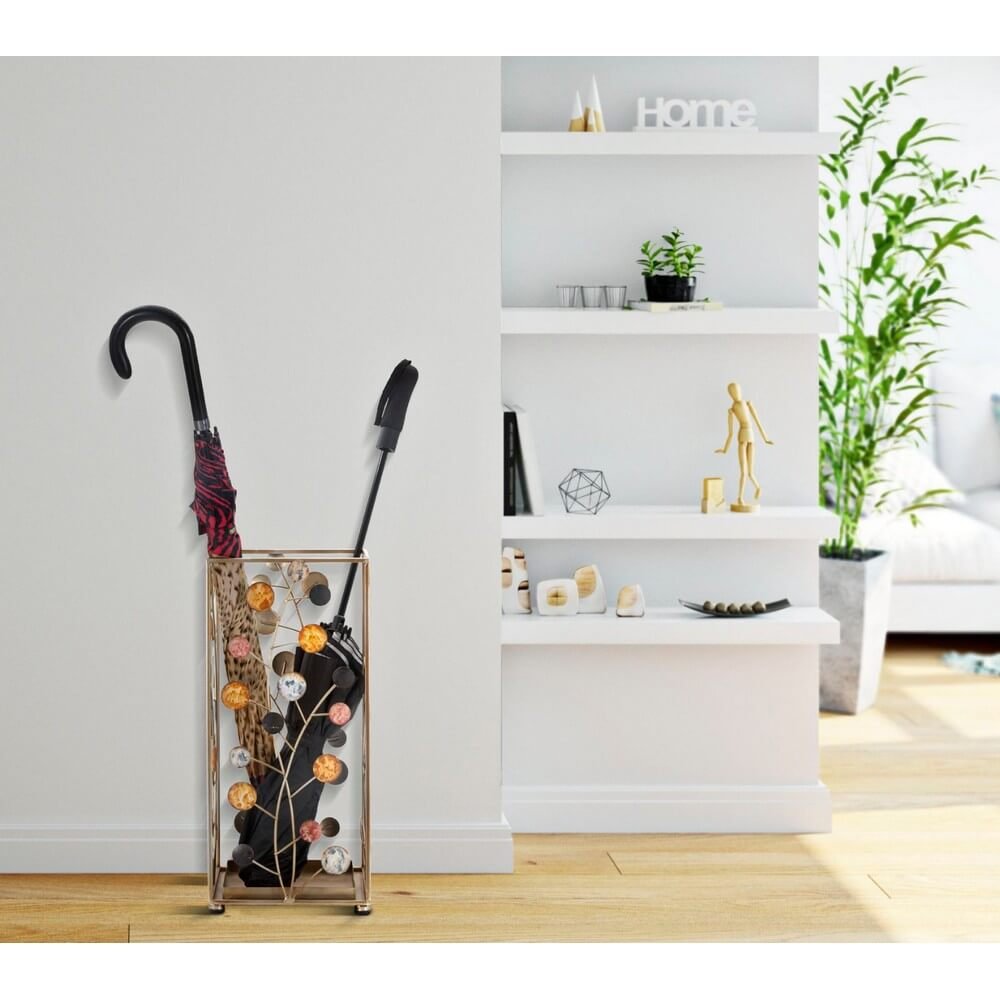 Elegante portaombrelli quadrato in metallo dorato con cerchi decorativi di diversi colori che richiamano i rami degli alberi con foglie e frutti. Un dolce tocco di eleganza per ogni ingresso.