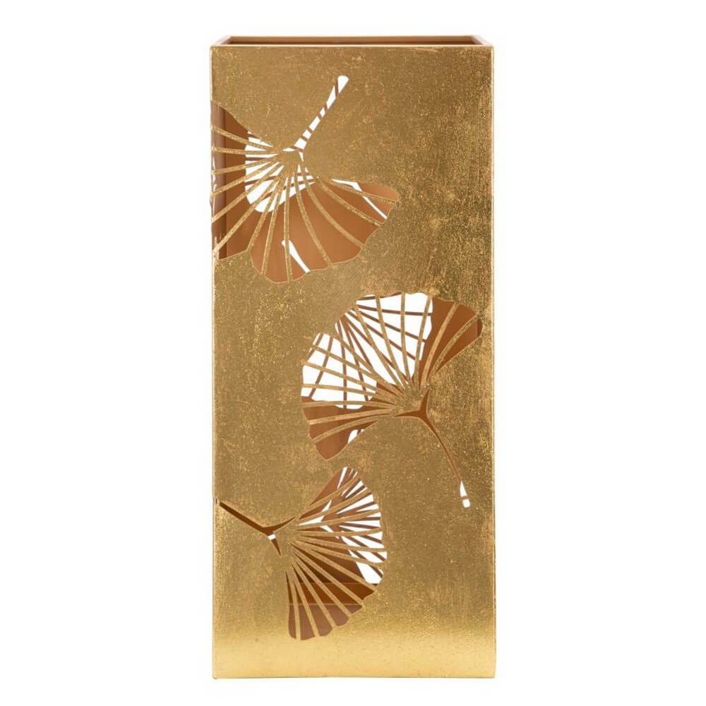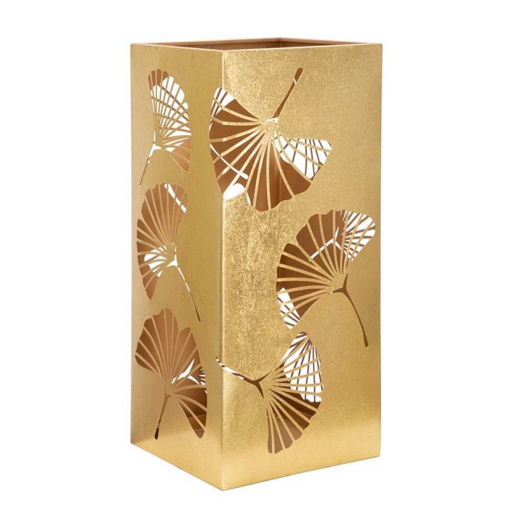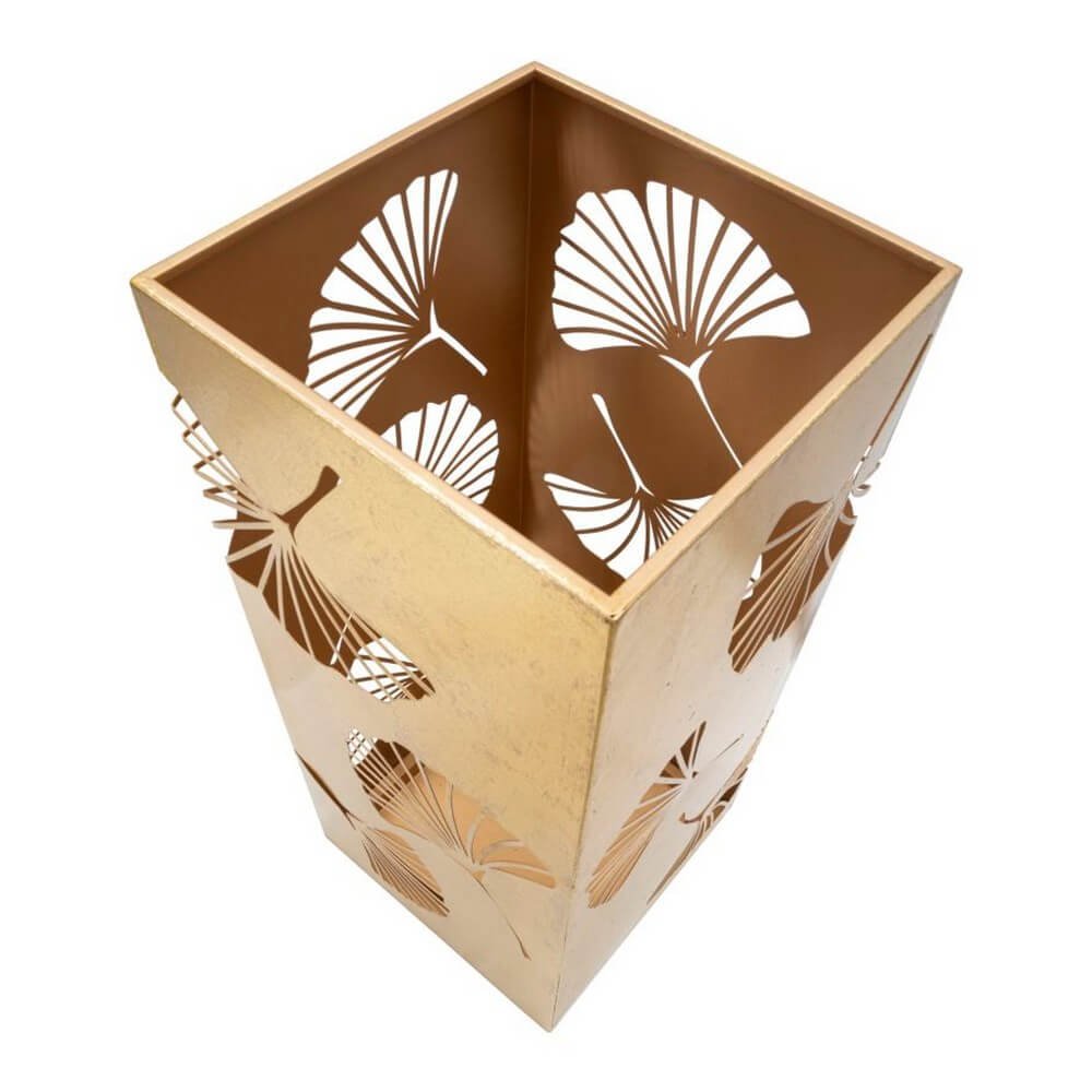 Portaombrelli quadrato in metallo dorato elegantemente decorato con foglie intagliate. La cura del dettaglio insieme alla struttura regolare e geometrica creano un insieme che può essere combinato a qualsiasi tipo di arredo.