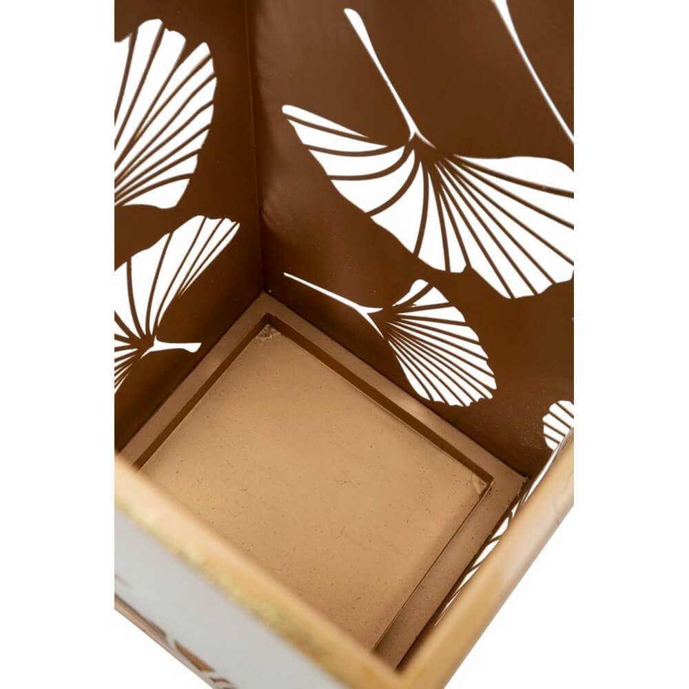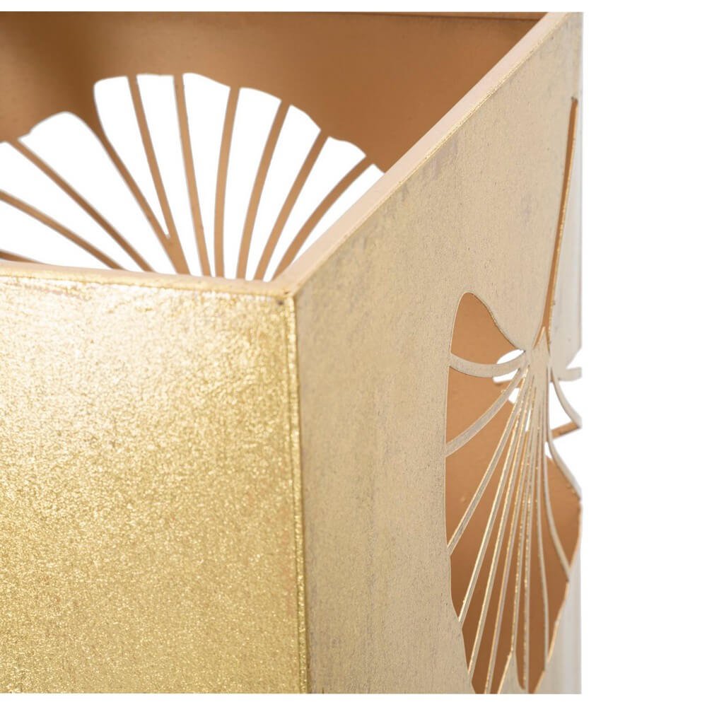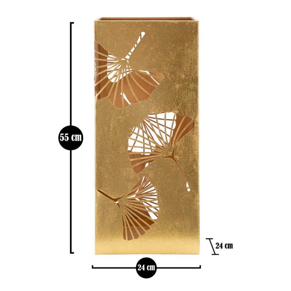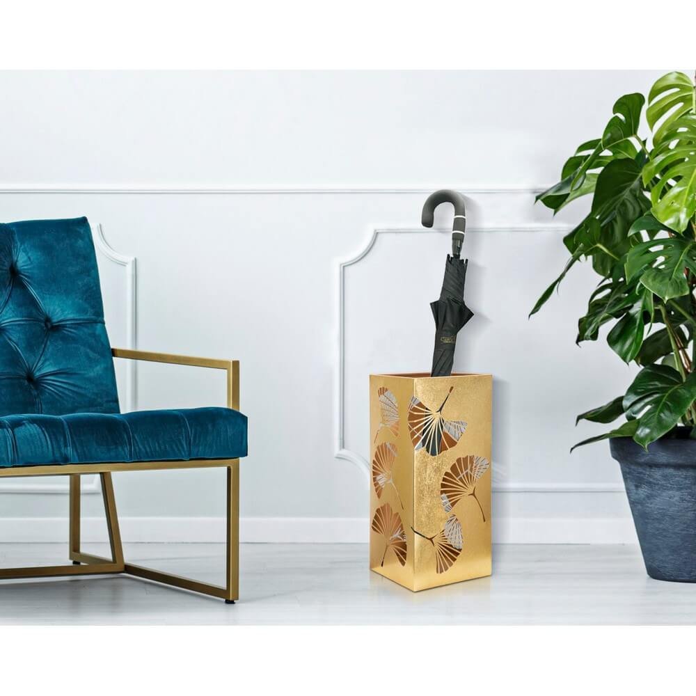 Portaombrelli quadrato in metallo dorato elegantemente decorato con foglie intagliate. La cura del dettaglio insieme alla struttura regolare e geometrica creano un insieme che può essere combinato a qualsiasi tipo di arredo.