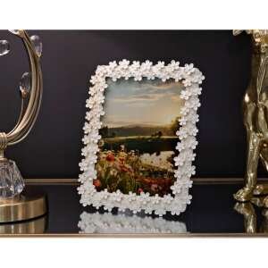 Cornice rettangolare da appoggio in resina dal design composto da un insieme di fiorellini. Puรฒ essere posizionata sia in orizzontale che in verticale. Dimensioni foto cm 15×20.