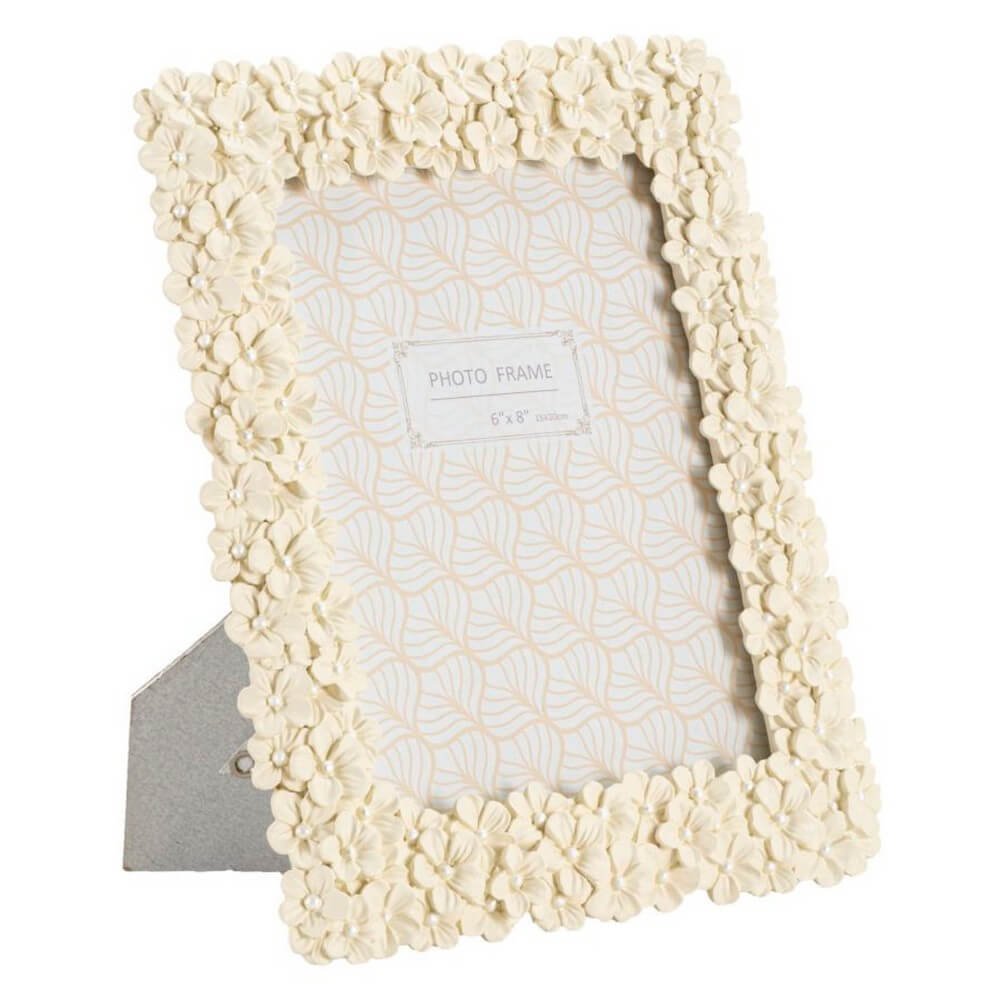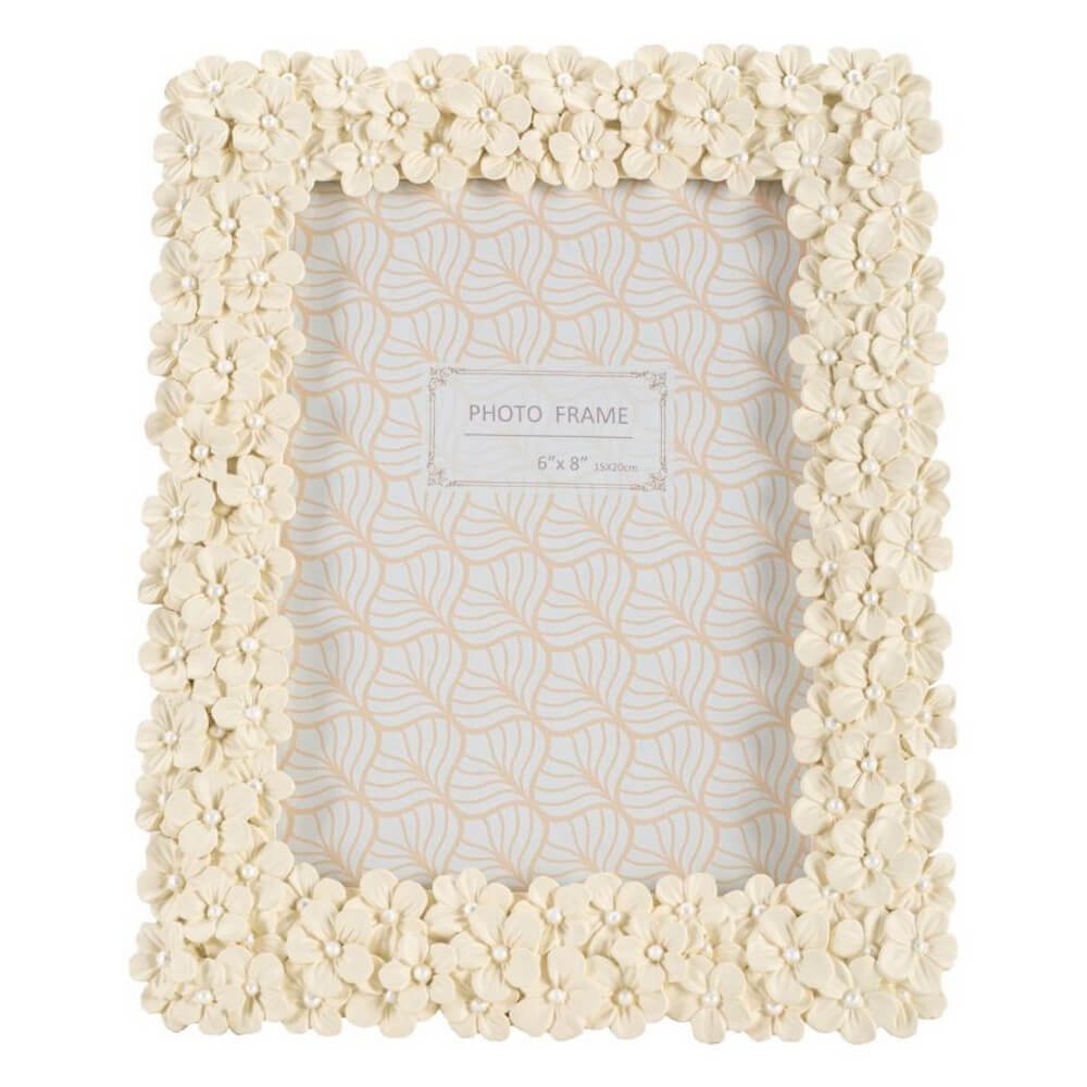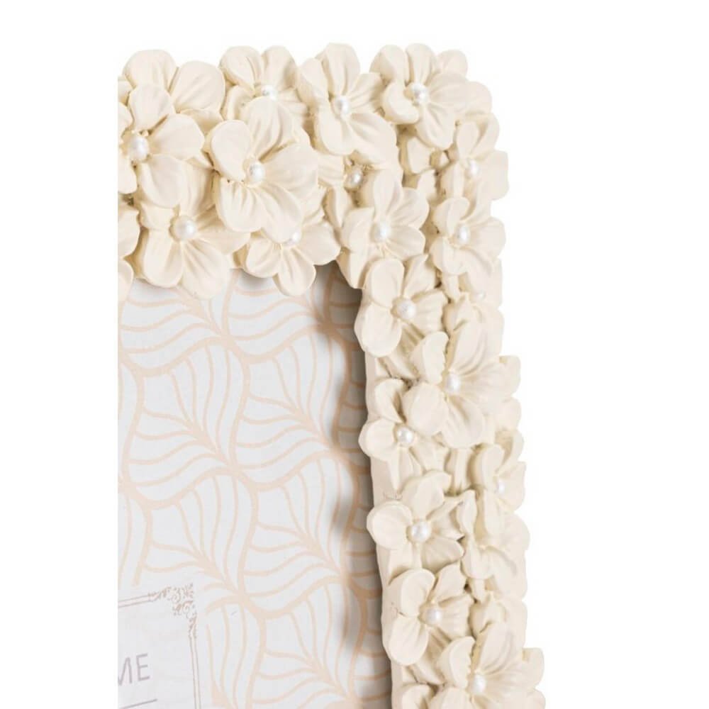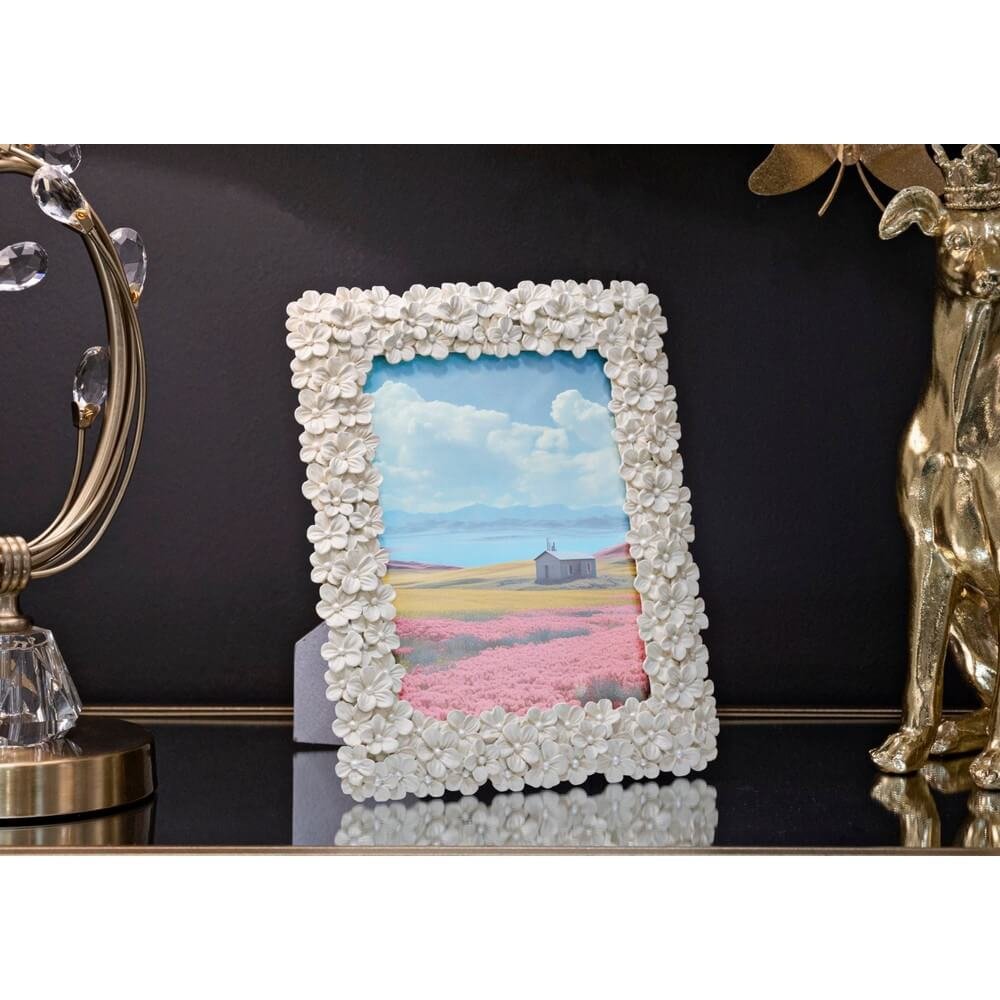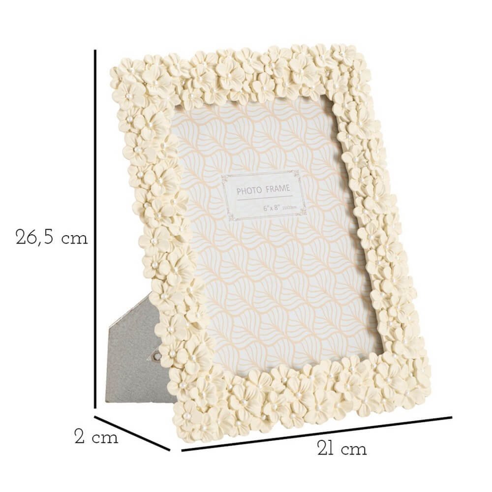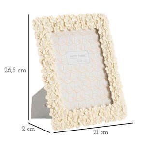 Cornice rettangolare da appoggio in resina realizzata da un insieme di fiorellini. Puรฒ essere posizionata sia in orizzontale che in verticale. Dimensioni foto cm 15×20.