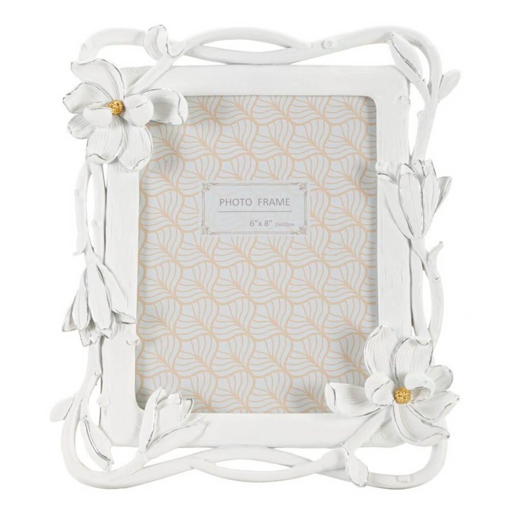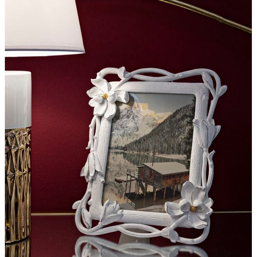 Cornice rettangolare da appoggio in resina dalle linee morbide realizzate da un intreccio di fiori. Puรฒ essere posizionata sia in orizzontale che in verticale. Dimensioni foto cm 15×20.
