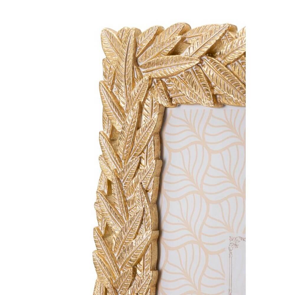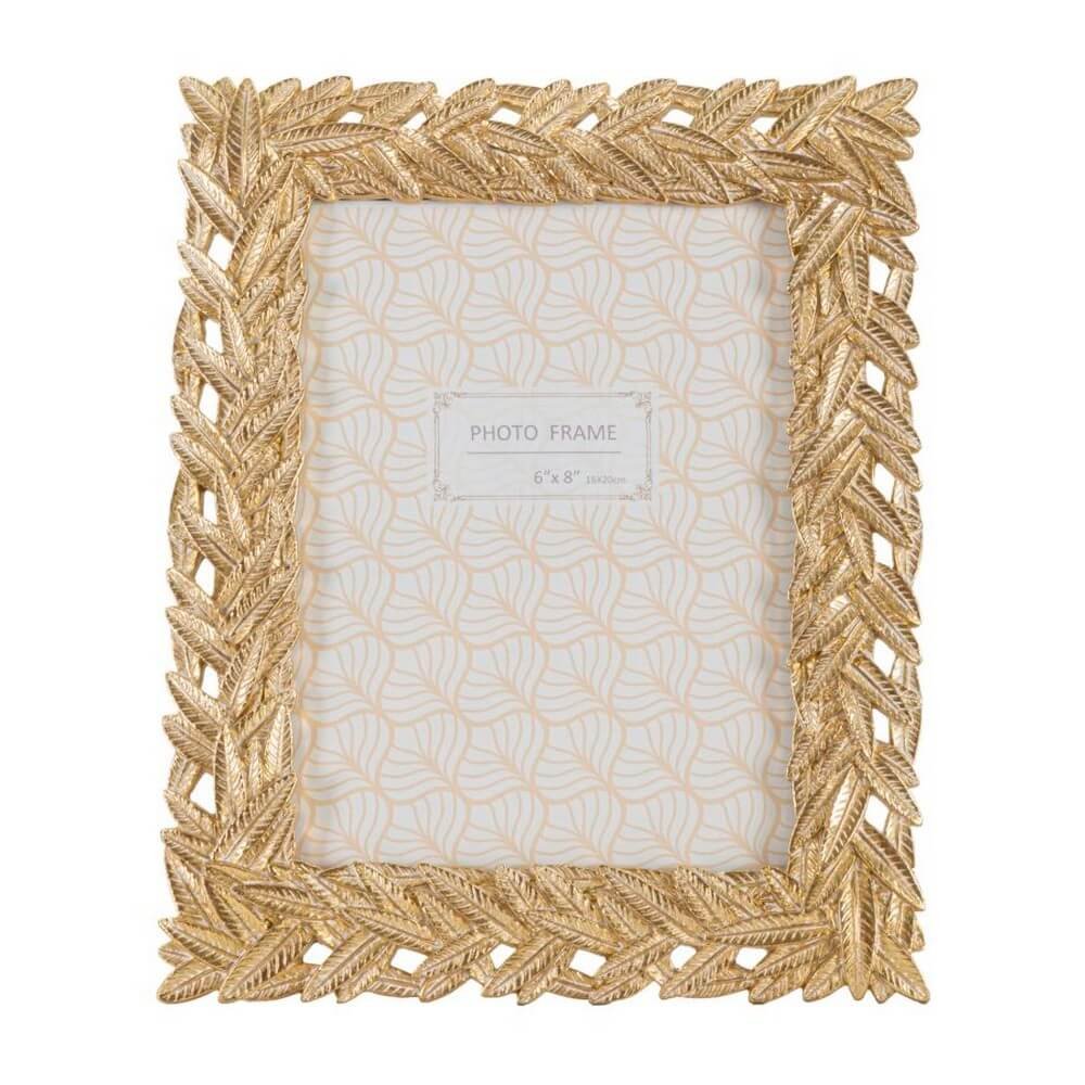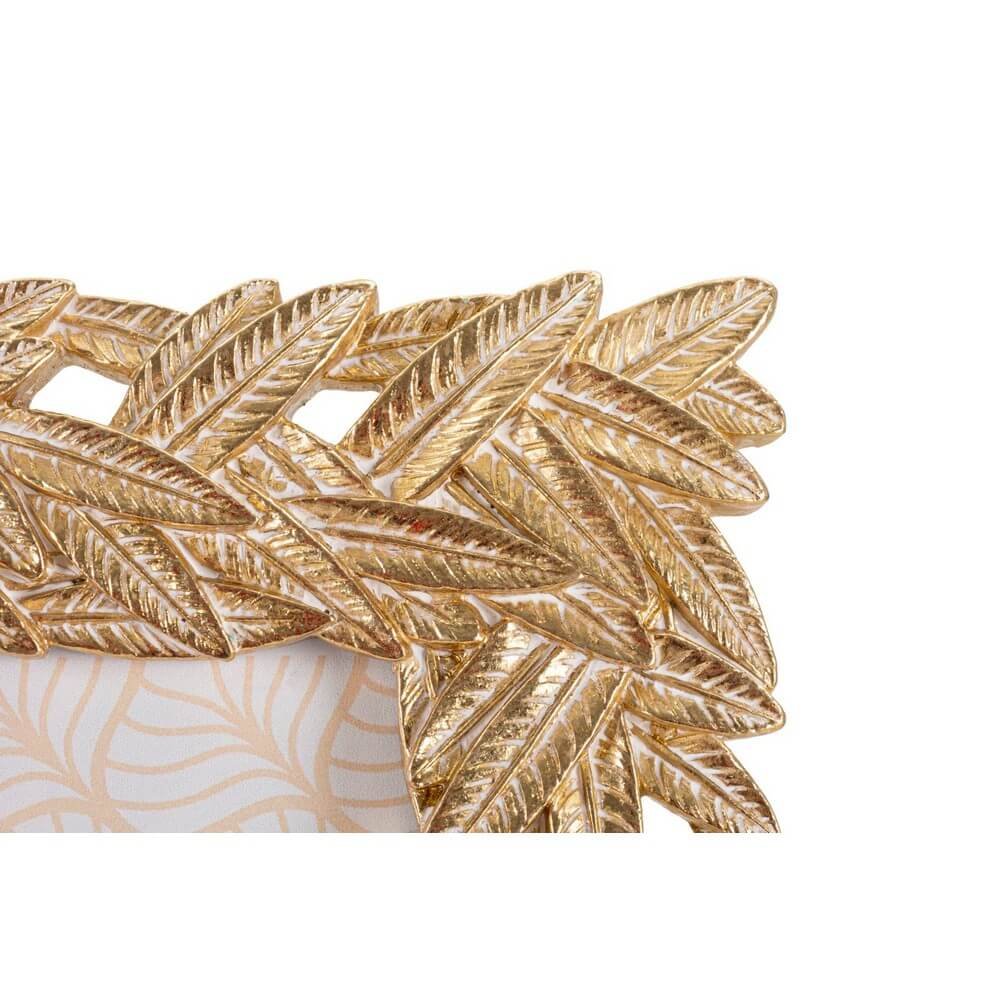 Cornice rettangolare da appoggio in resina dal design composto da un intreccio di foglie. Puรฒ essere posizionata sia in orizzontale che in verticale. Dimensioni foto cm 15×20.