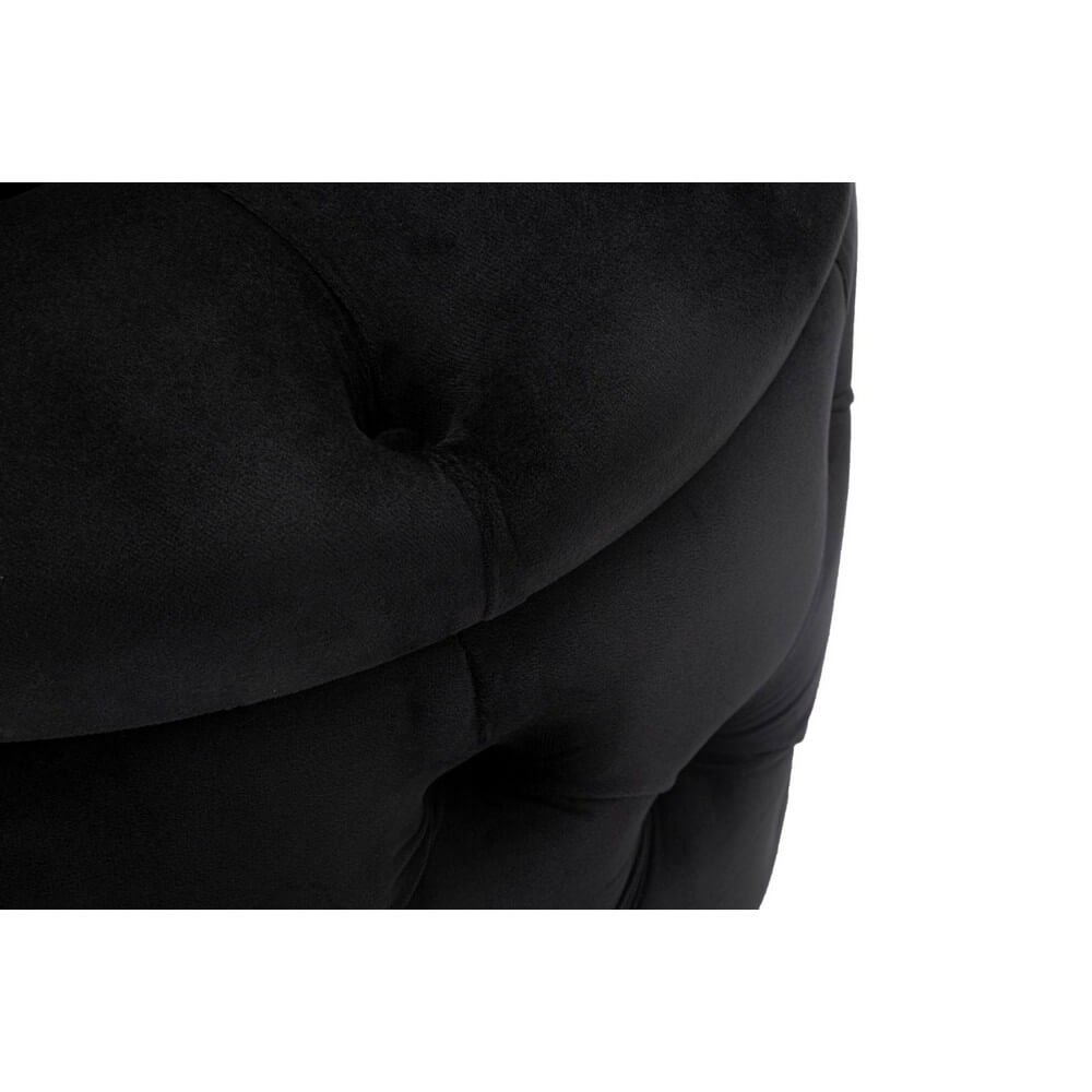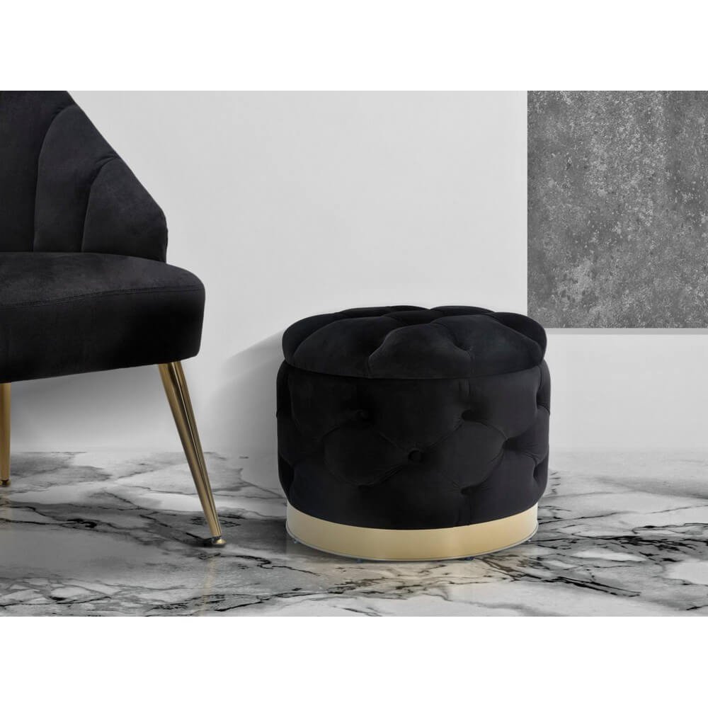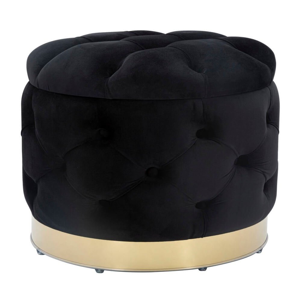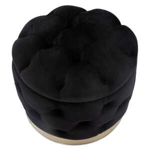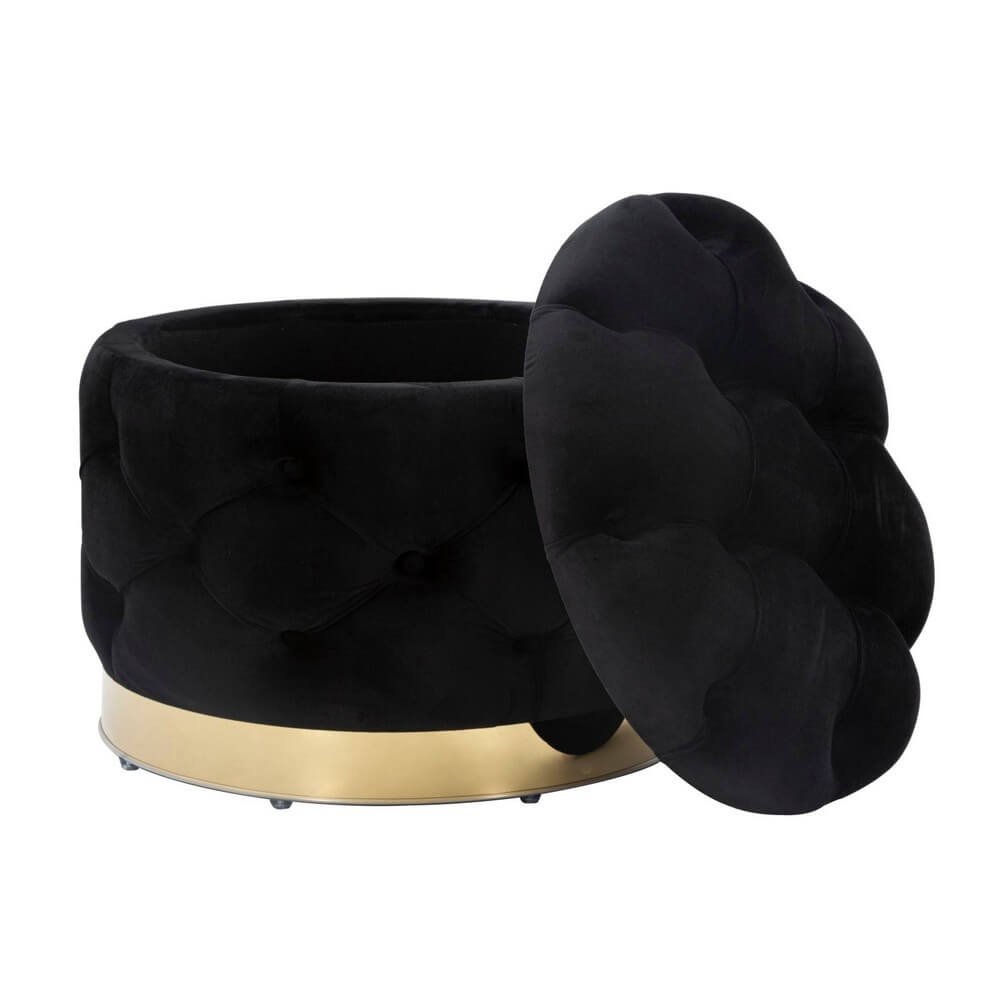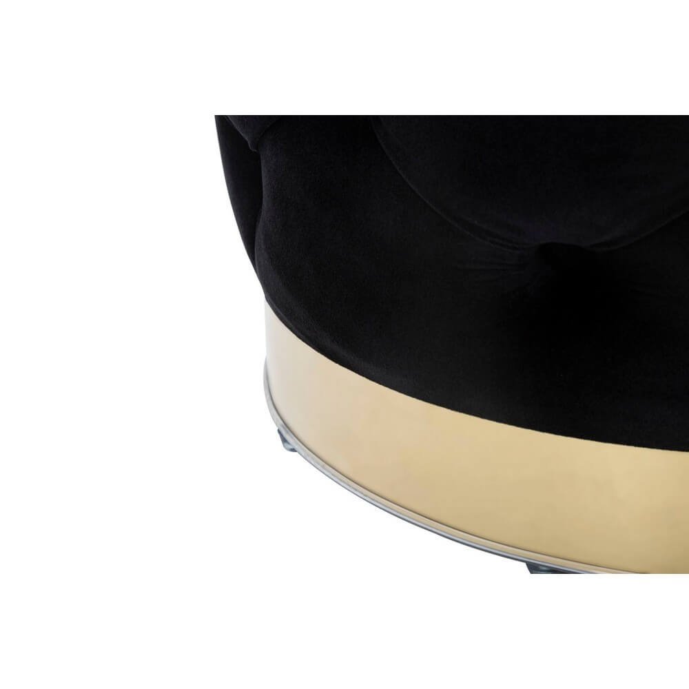 Puff rotondo in mdf e tessuto imbottito nero con decori dorati. Sontuosi poufs in velluto accoglieranno i tuoi ospiti trasportandoli in una magica atmosfera liberty anni ’20.
