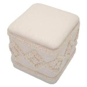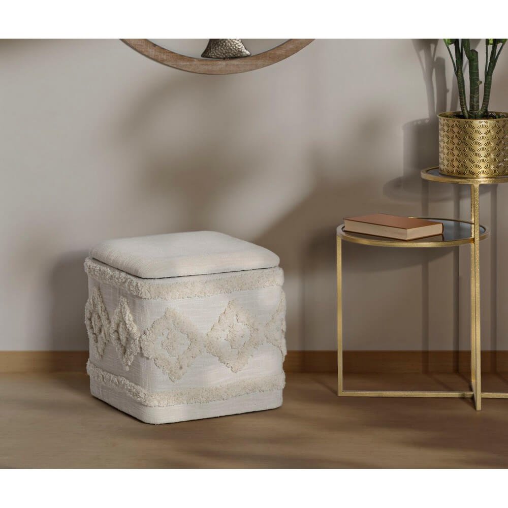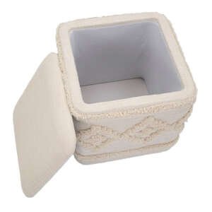 Pouf quadrato in tessuto imbottito elegantemente decorato, la seduta si apre rivelando un pratico contenitore.