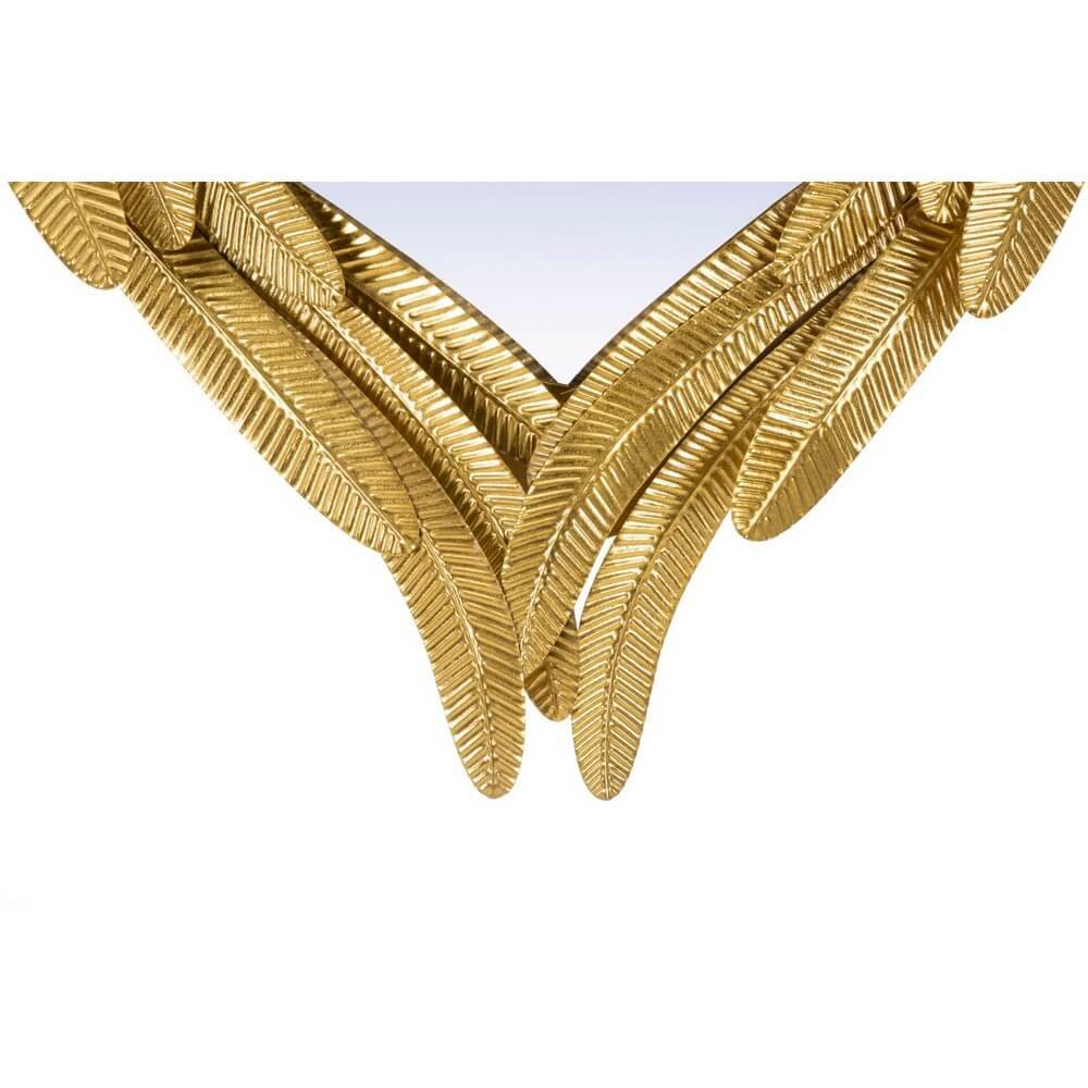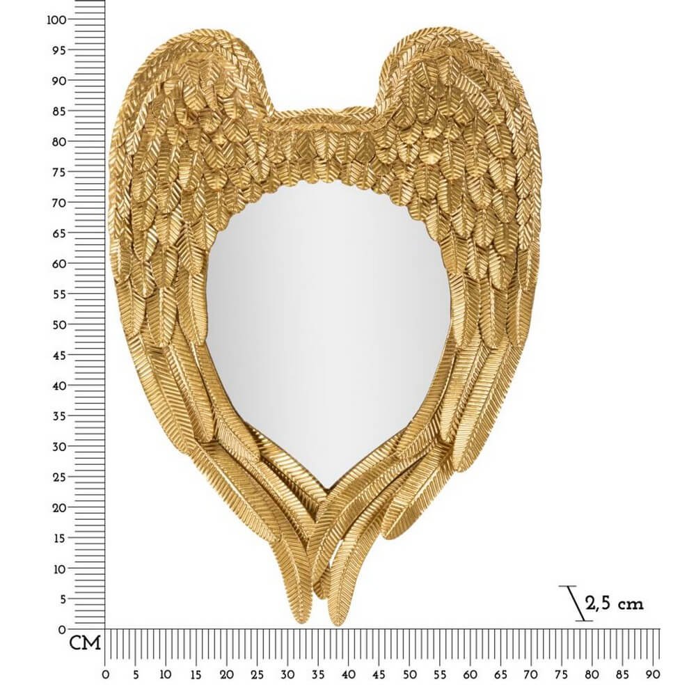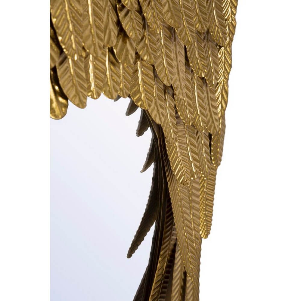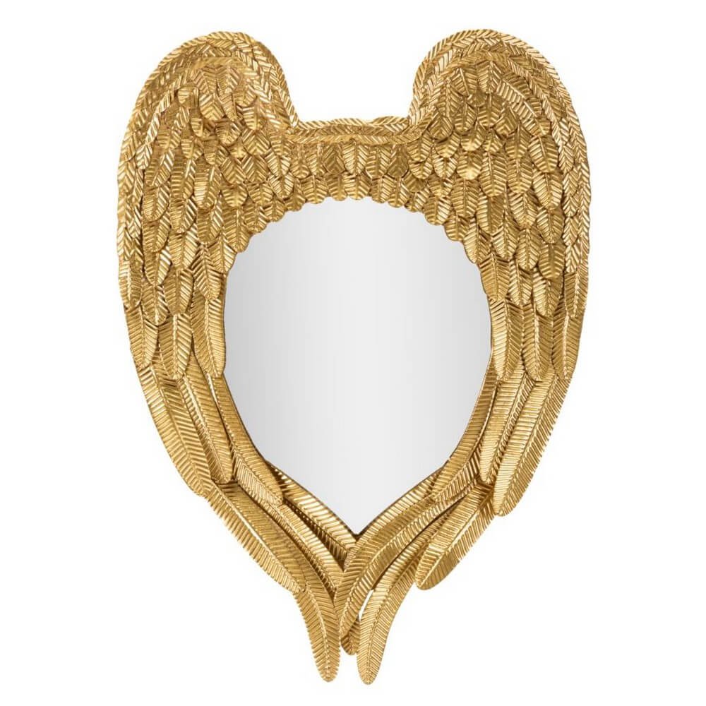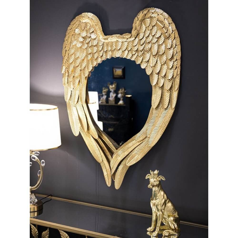 Specchio da parete con cornice in metallo dorato a forma di paio di ali che si accoppiano.