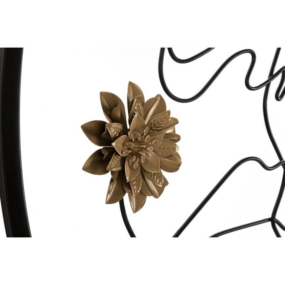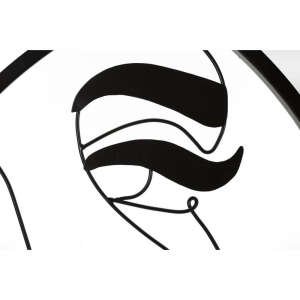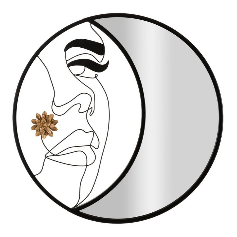 Specchio da parete a forma di mezzaluna incastonato in una struttura rotonda decorata con linee morbide che compongono un volto dai tratti che richiamano l’arte cubista.