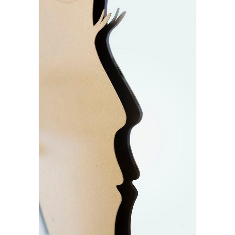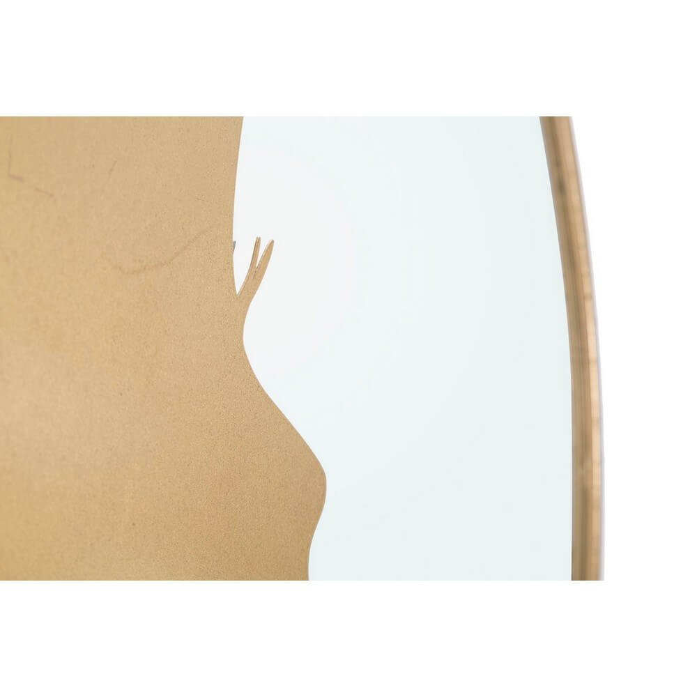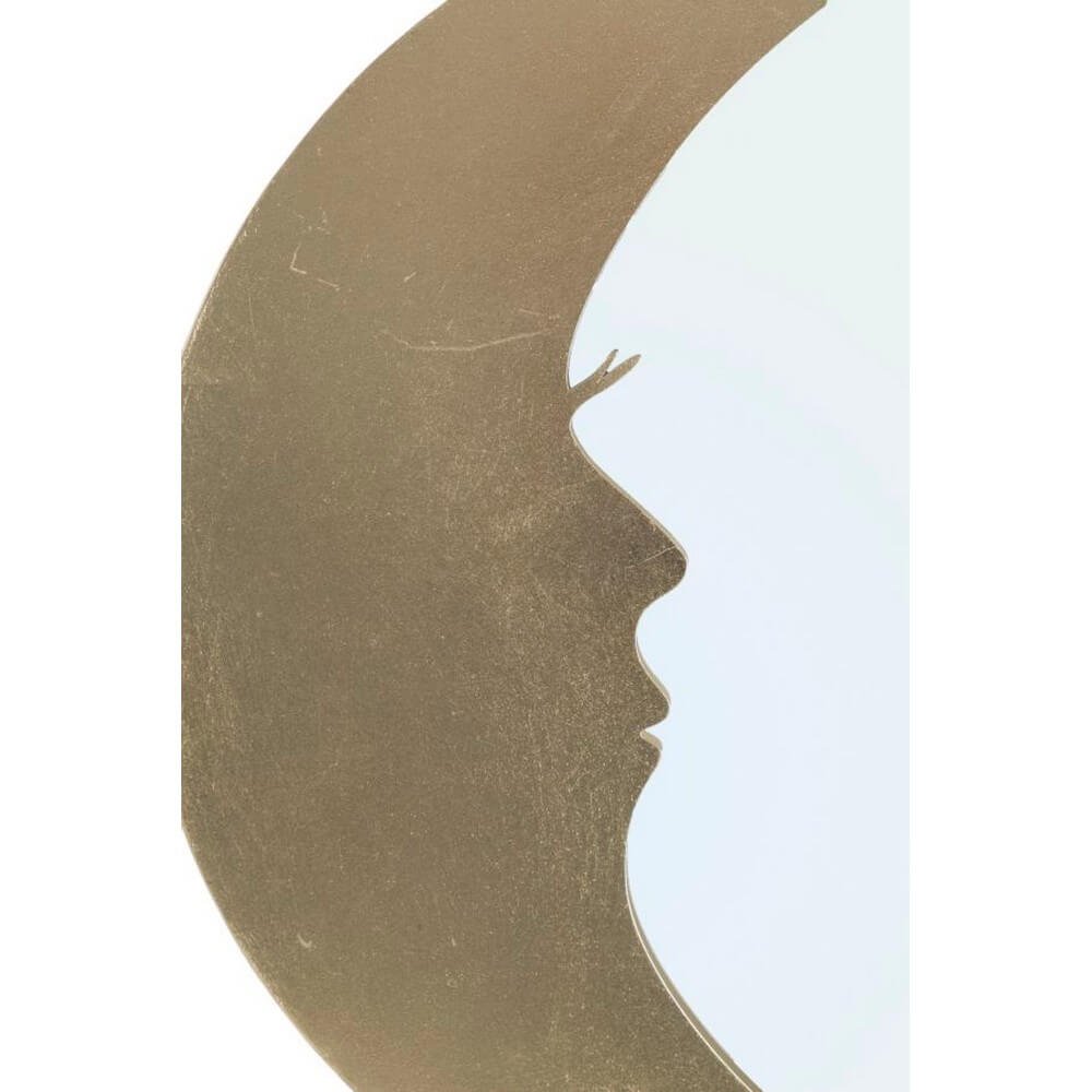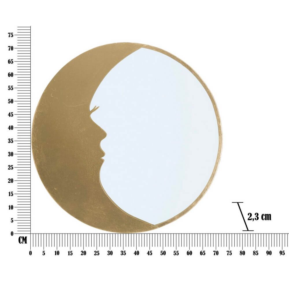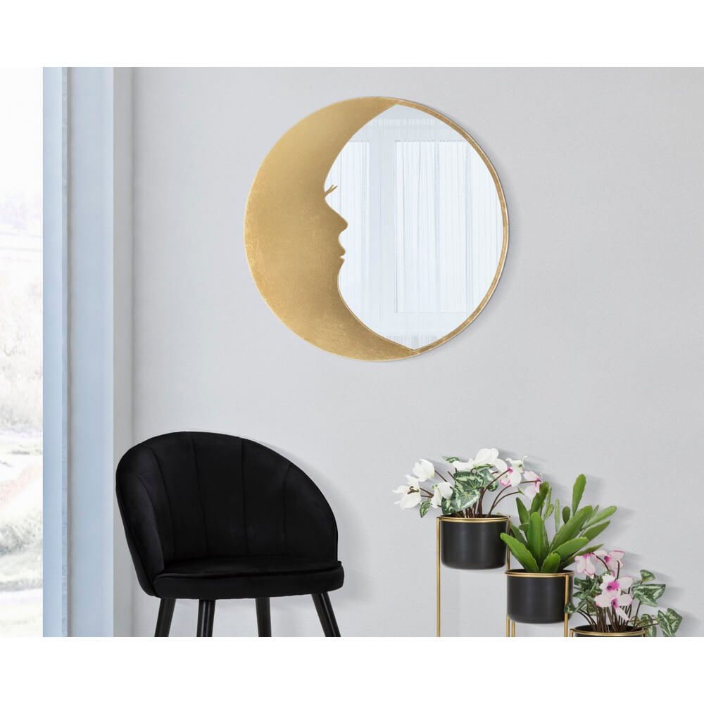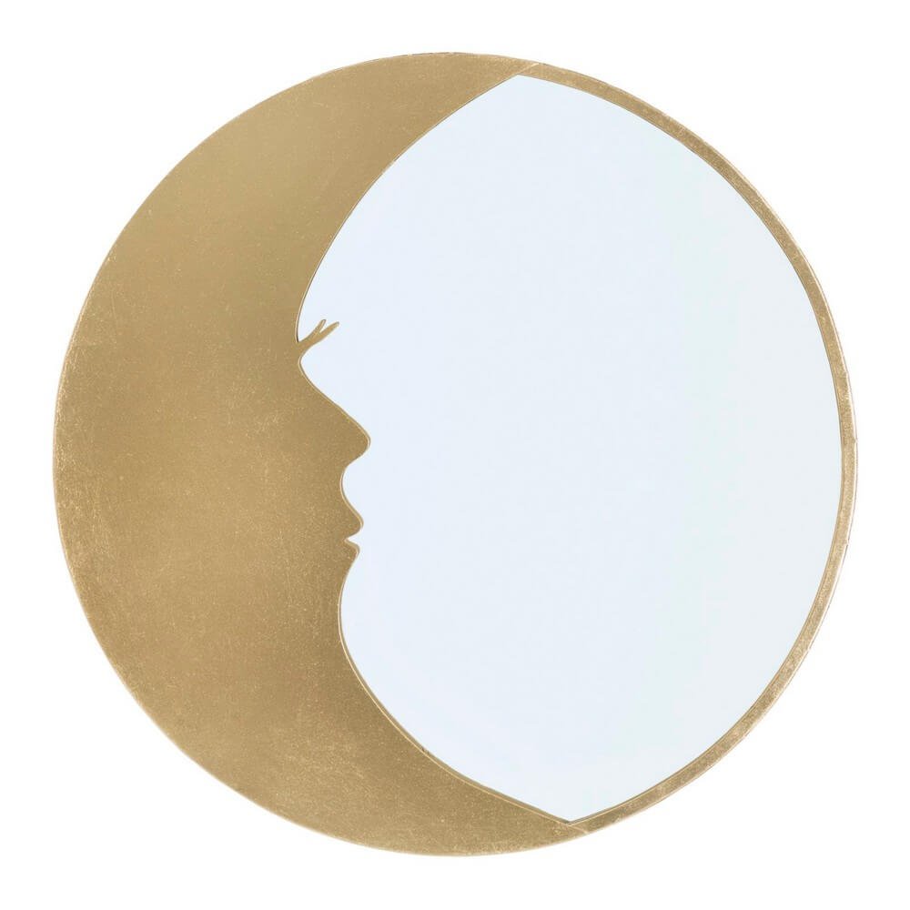 Specchio rotondo da parete in metallo dorato. La cornice a forma di mezza luna fusa ad un profilo di donna richiama alla memoria la personificazione della luna e la poesia.