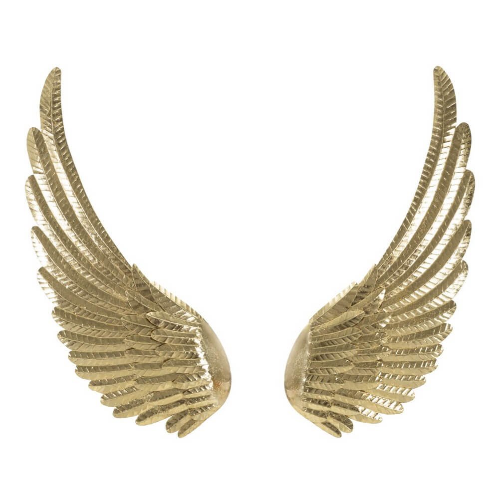 Coppia di pannelli decorativi 3D da parete in metallo dorato che compongono un paio di ali.