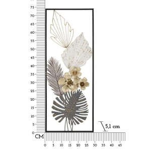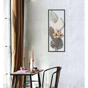 Pannello decorativo 3D da parete in metallo composto da foglie e fiori in un’elegante cornice rettangolare.