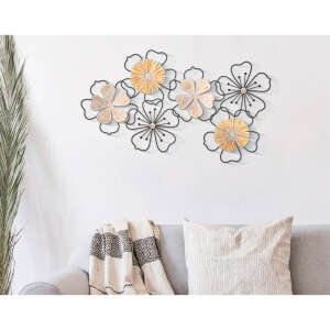 Pannello decorativo 3D da parete in metallo e legno composto da fiori.