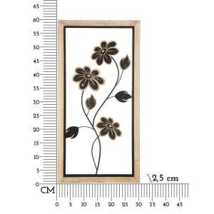 Pannello decorativo 3D da parete in metallo e legno composto da eleganti fiori racchiusi in una cornice rettangolare in legno.