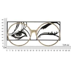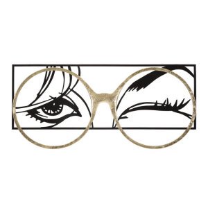 Pannello decorativo 3D da parete in metallo nero raffigurante uno sguardo con occhiali in metallo dorato.