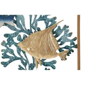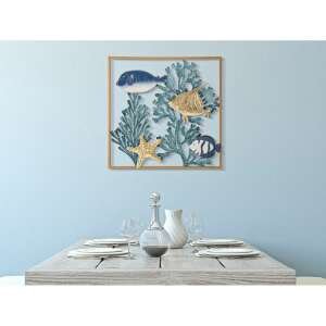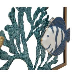 Pannello decorativo 3D da parete in metallo raffigurante dei pesci e dei coralli in un’elegante cornice dorata.