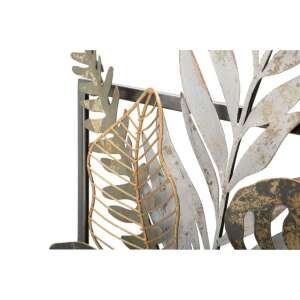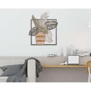 Pannello decorativo 3D da parete in metallo raffigurante un vaso con foglie racchiuso in una cornice quadrata.