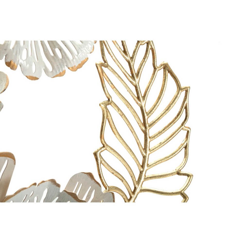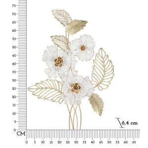 Pannello decorativo 3D da parete in metallo composto da rami e foglie dorate con fiori bianchi e dorati.