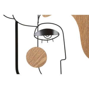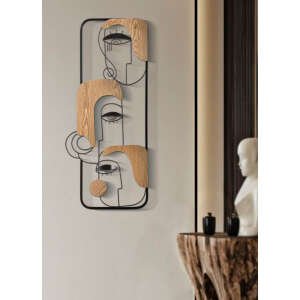 Pannello decorativo 3D da parete in metallo e legno raffigurante dei volti dai tratti che richiamano l’arte cubista.