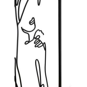 Pannello decorativo 3D da parete in metallo nero dai tratti delicati e sinuosi che vanno a comporre una figura di donna con copricapo seduta di spalle.